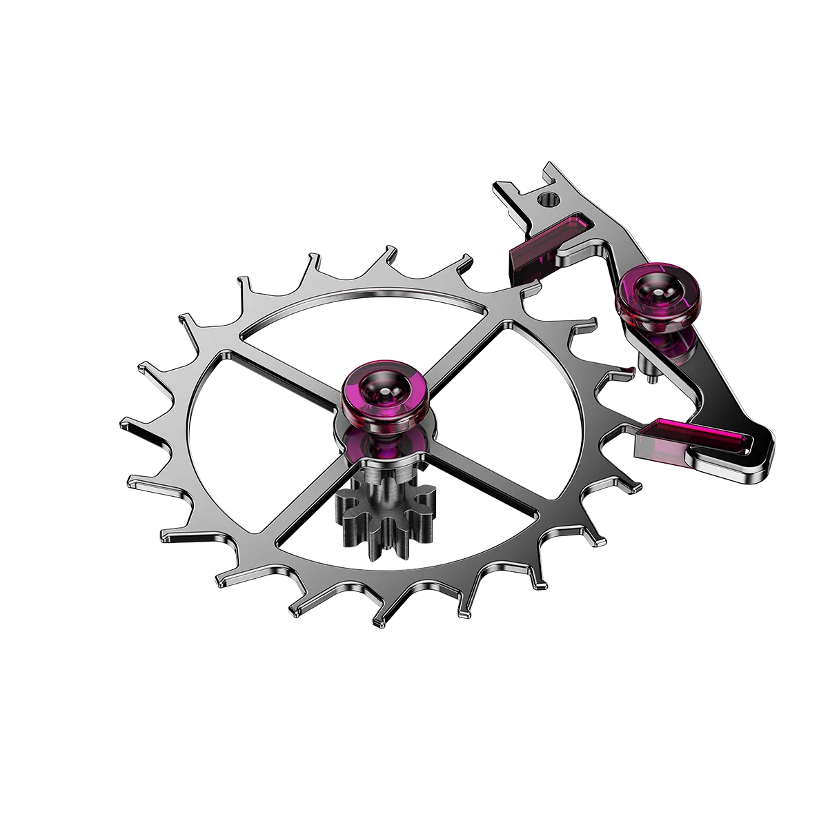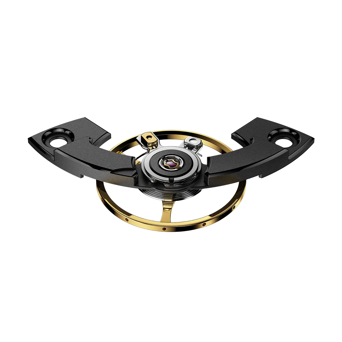 The elegant and modern architecture of the balance wheel transversal bridge, with its two fixing points, guarantees high positioning precision. This double bridge helps ensure the stability, shock resistance and precision of the balance wheel whatever the intensity of the activities carried out.