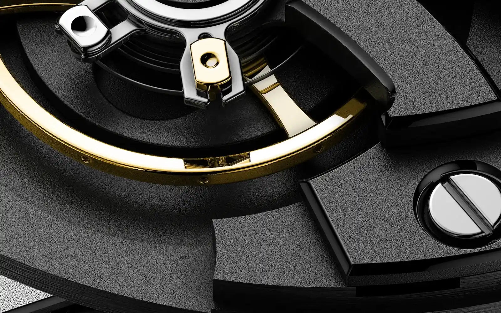 The CMM.10 was designed as an innovative, new generation, high performance caliber. In order to reinforce the contemporary appearance of the caliber we have opted for a modern and differentiating aesthetic with black galvanic decoration of the bridges and plate. The micro blasting treatment of the mainplate and bridges, applied with a sand blasting machine, results in a neutral, matt surface finish in contrast with the oscillating weight "gunmetal" finish. The uniform black galvanic coating preserves the decorative micro blasting finish of the surface.