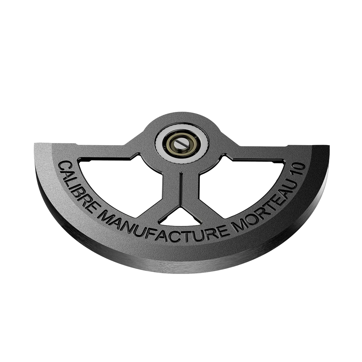 The bidirectional oscillating weight allows the mechanism to be automatically wound using the kinetic energy produced by the wearer's movements. Whatever the direction of rotation of the oscillating weight, it operates by charging the large spring barrel which, once fully wound, offers 70 hours of autonomy. The oscillating weight is mounted on optimized ball bearings that are very resistant to wear and minimize friction, rotate smoothly and silently. Engraved with the words CALIBRE MANUFACTURE MORTEAU 10 and decorated in a “gunmetal” finish in contrast with the galvanized black bridges, the design of the oscillating weight reinforces the innovative and contemporary aesthetic of the caliber.