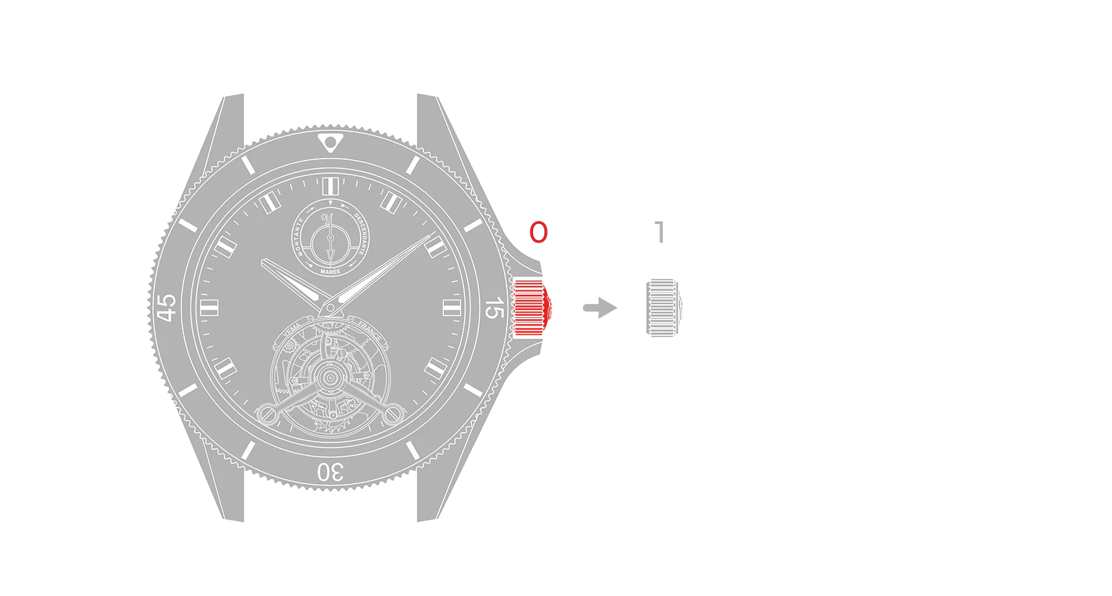 - After any adjustment, always return the crown to the pushed position (Position 0). To do this, simply press the crown against the case.