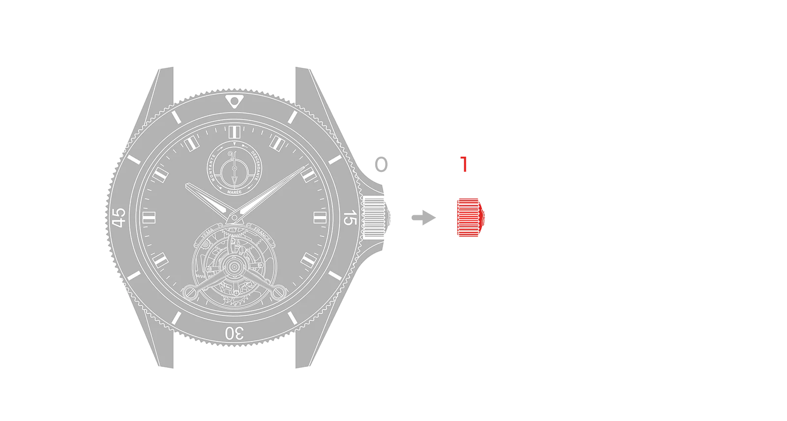 NB: When adjusting the hands of your watch counterclockwise, the tourbillon cage may stop or “jump” due to its gearing. This is a completely normal and it does not affect the proper functioning of your watch or the tourbillon movement.