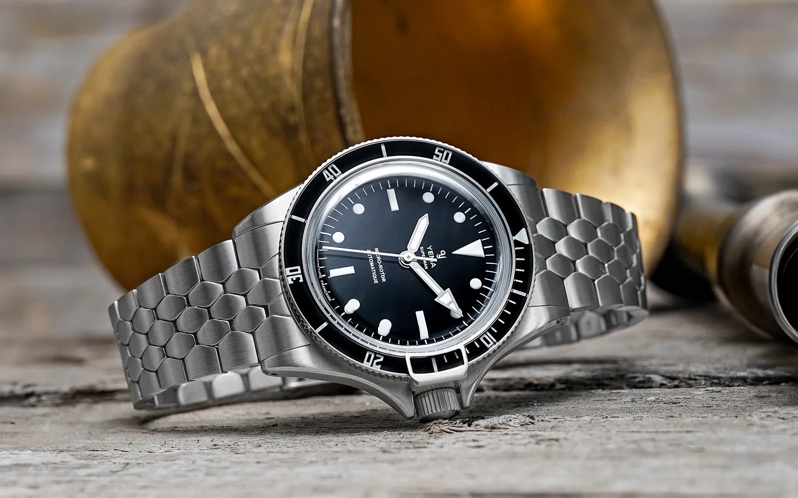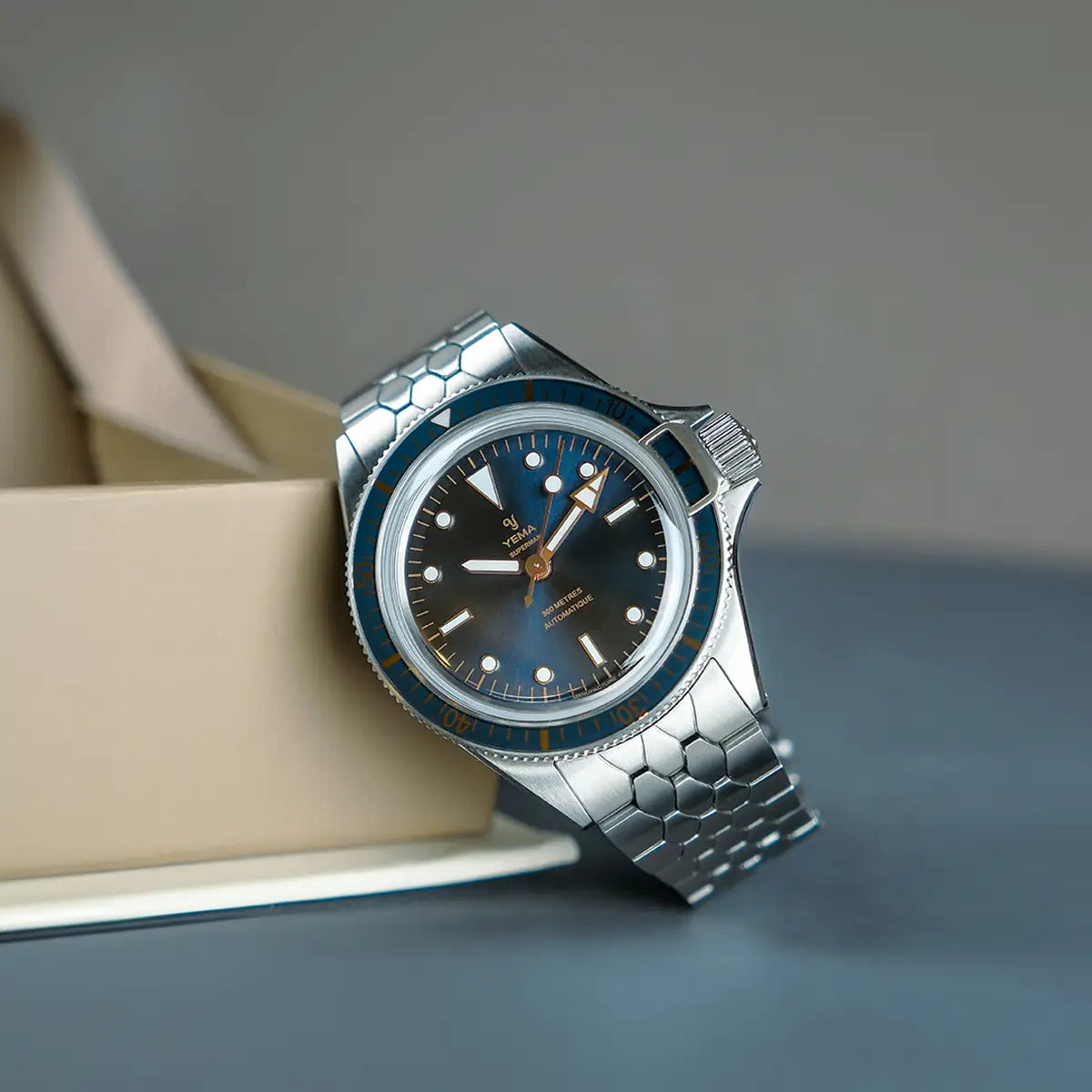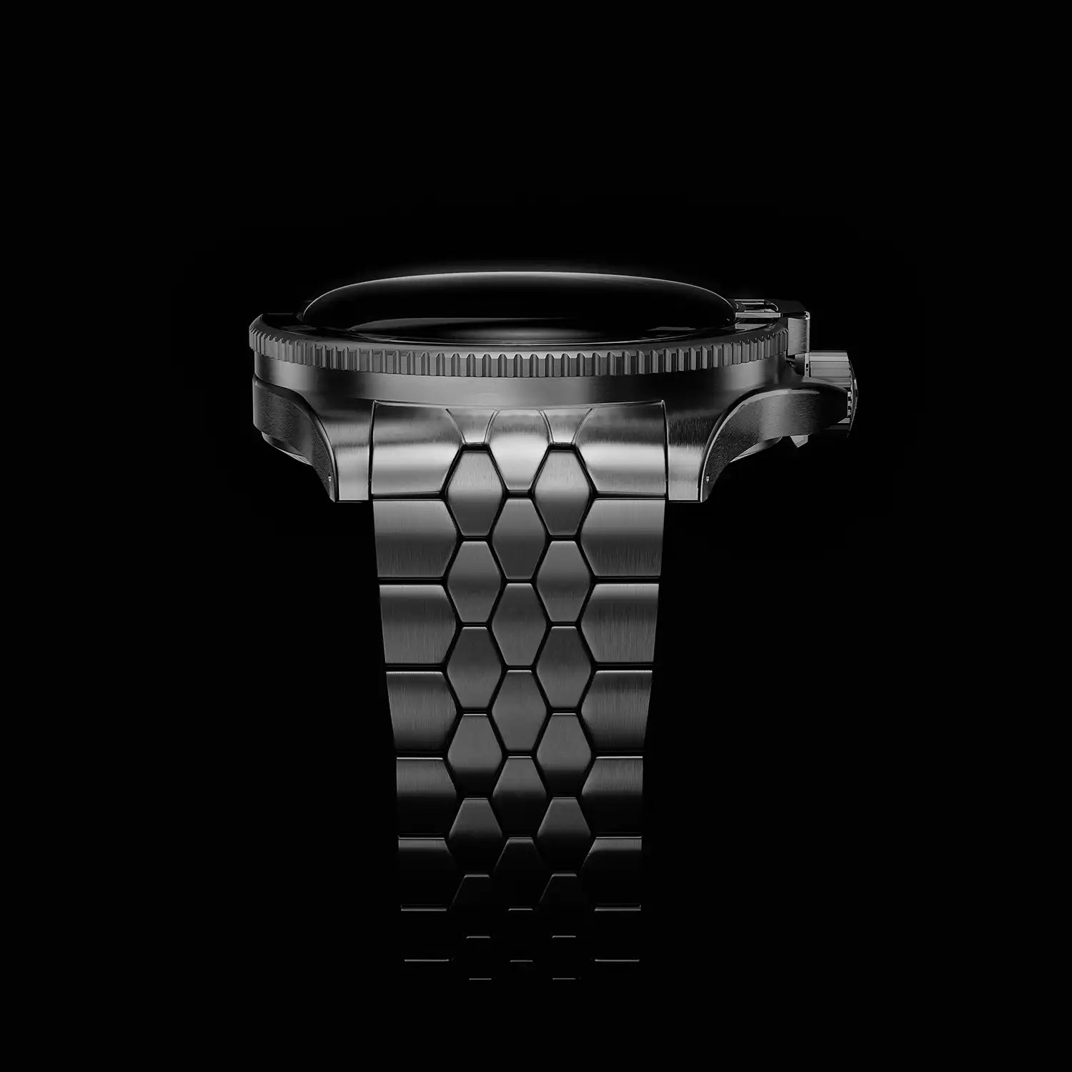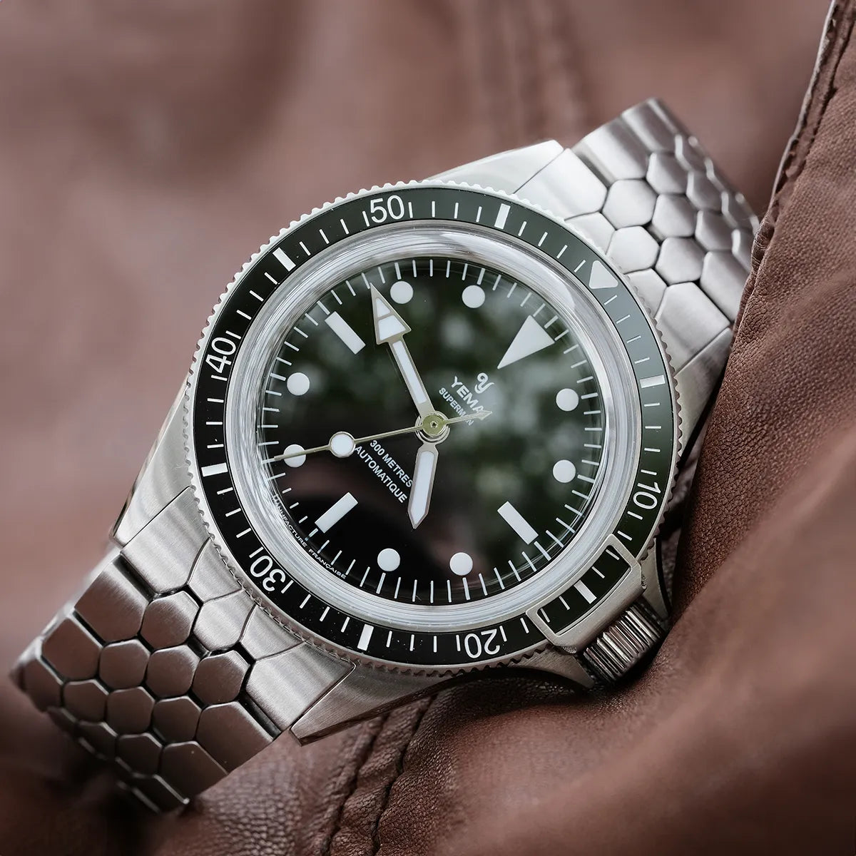The iconic 1960s YEMA Scales bracelet has been slimmed down by 0.40mm so as to harmoniously integrate with the Superman's thin case.