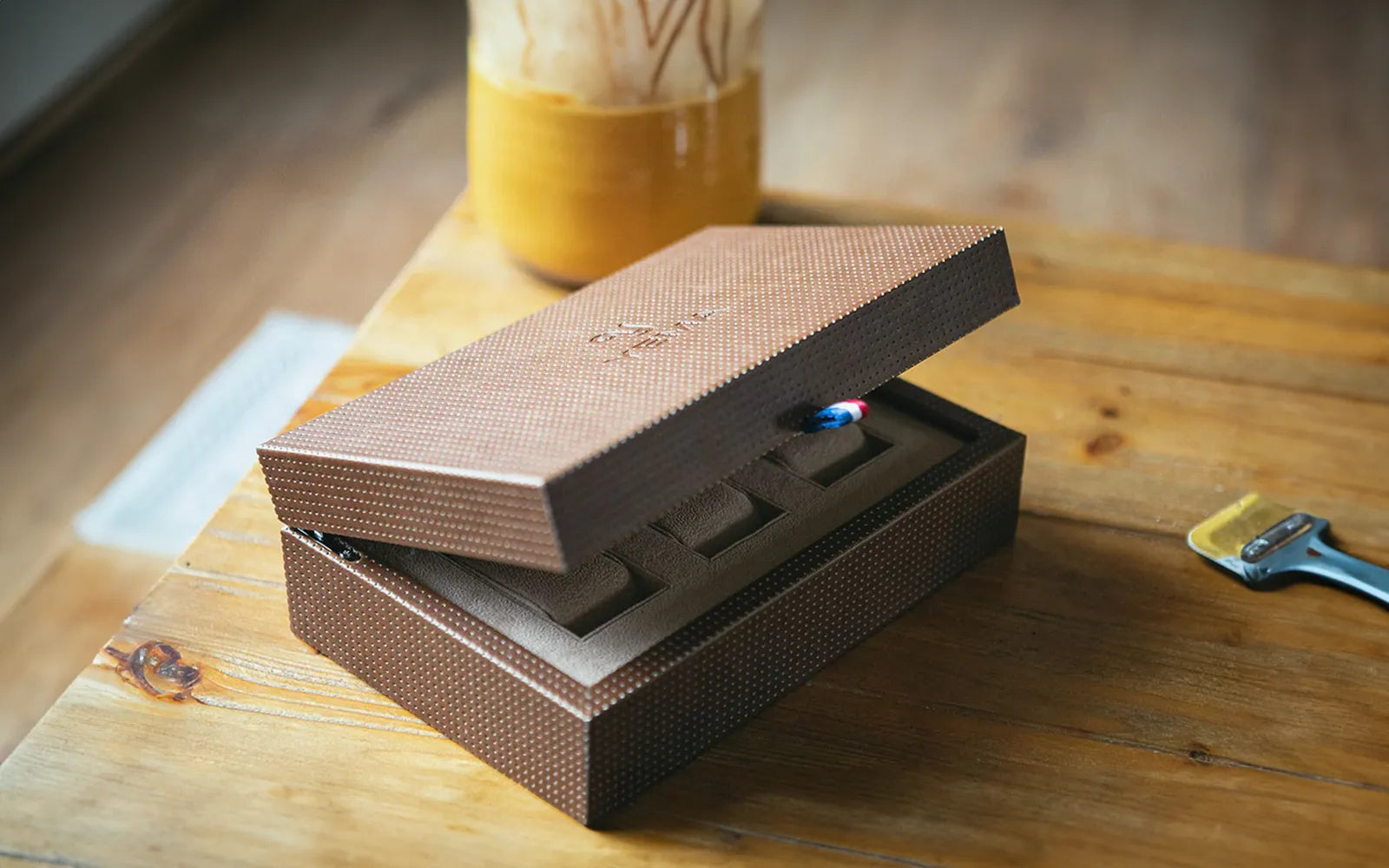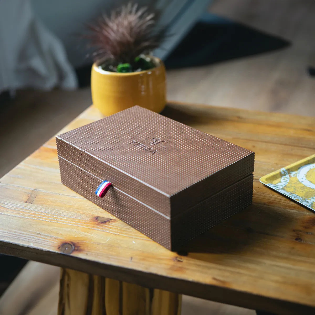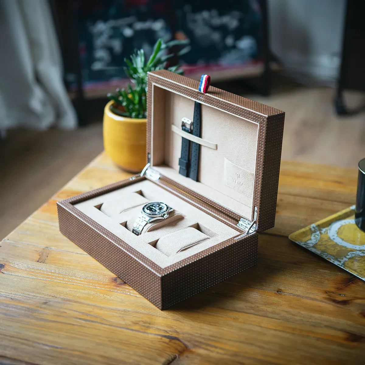 Preserve your most cherished timepieces with our luxury YEMA Collectors' Watch Box. Made in solid wood covered with perforated leatherette for a vintage sporty look, the interior is lined with suede. This collector's watch box accommodates up to three watches in style.