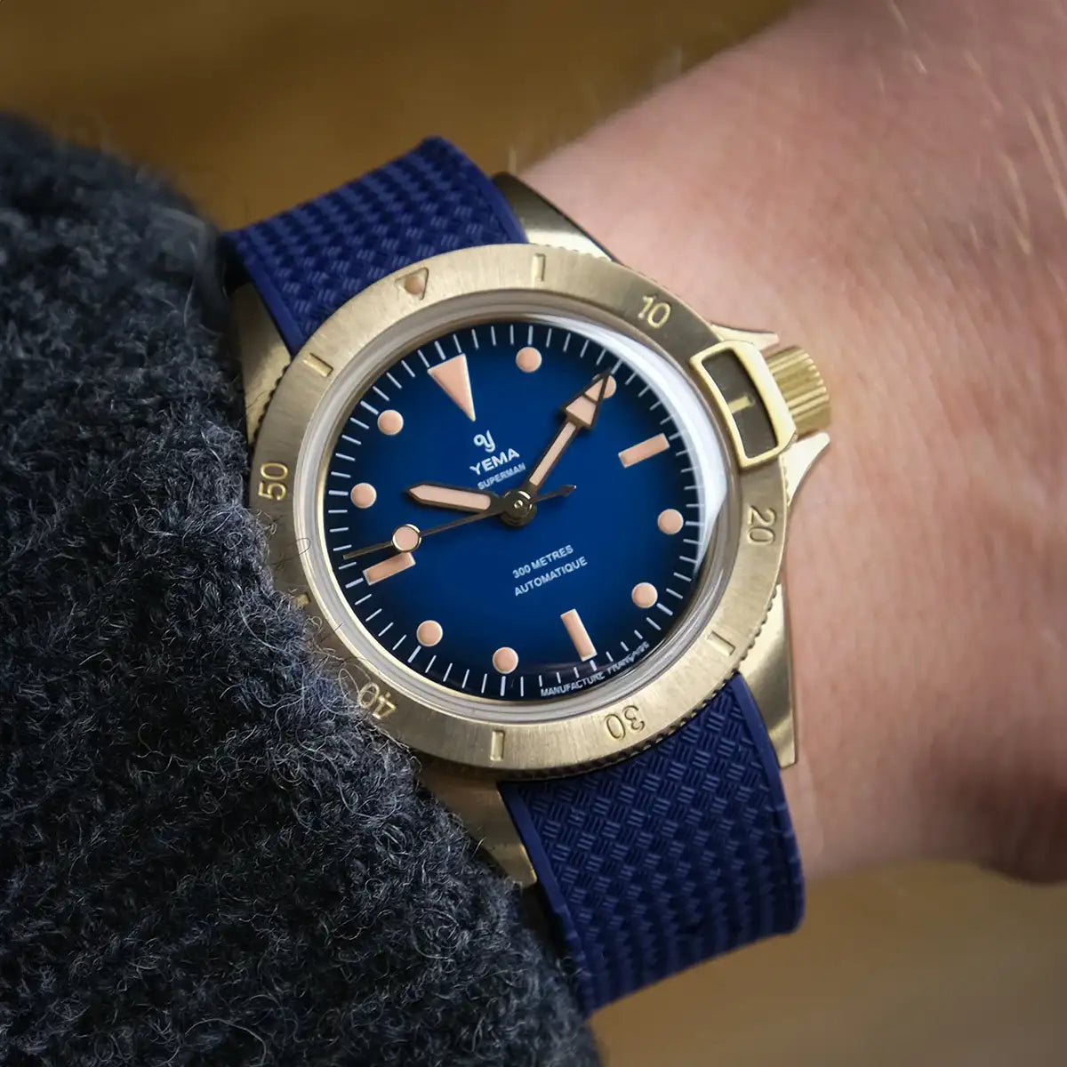 This Rubber integrated strap has been specifically designed to elegantly fit the long straight lugs of all Superman models and preserve its iconic retro aesthetic. Made from premium FKM VITON® rubber, this strap is ideal for diving due to its high resistance to saltwater, sun, and extreme temperatures, while providing comfortable fit and feel on the wrist.