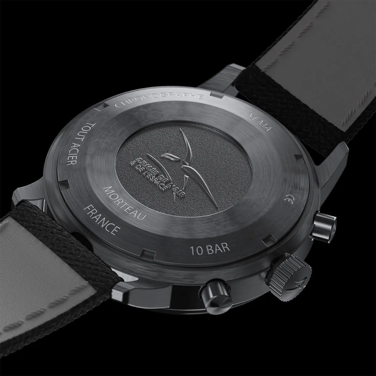 Manufactured in our region (Franche-Comté), the canvas (fabric) strap has been specially designed to match the dial colour. It features French Air Force logo on its leather coating underside, providing an enhanced wearing comfort.