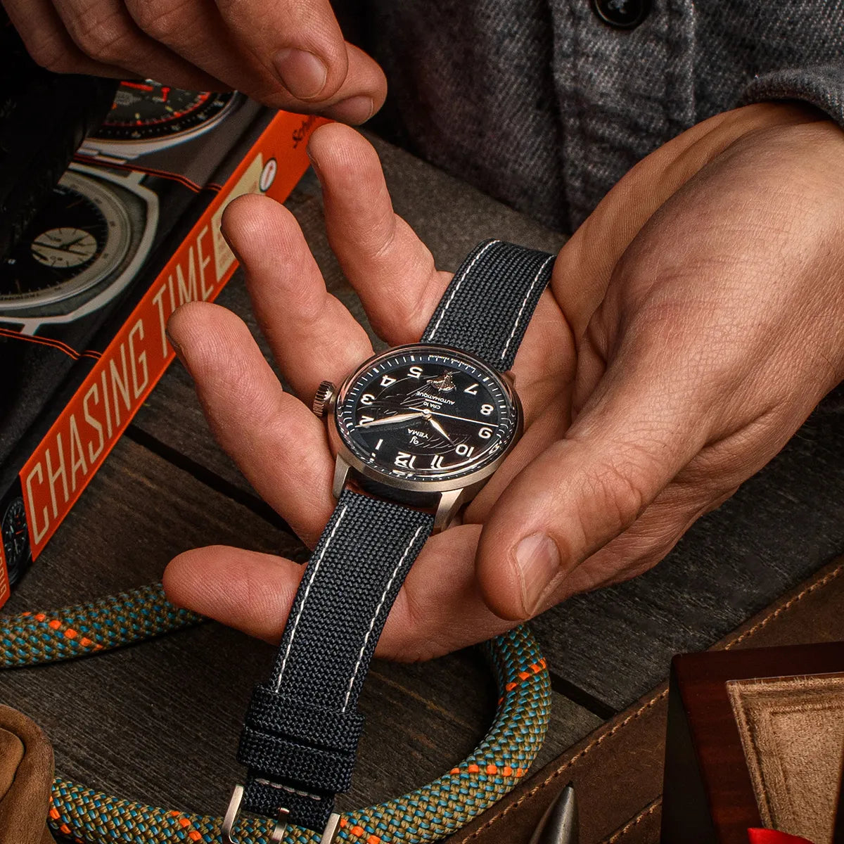 Made by a French manufacturer from our region (Franche-Comté), the CPA10 canvas strap with white stitching was specially designed to match the colors of the Flygraf CPA10. It features a leather lining on the underside for added wearing comfort, along with the French Air Force logo.