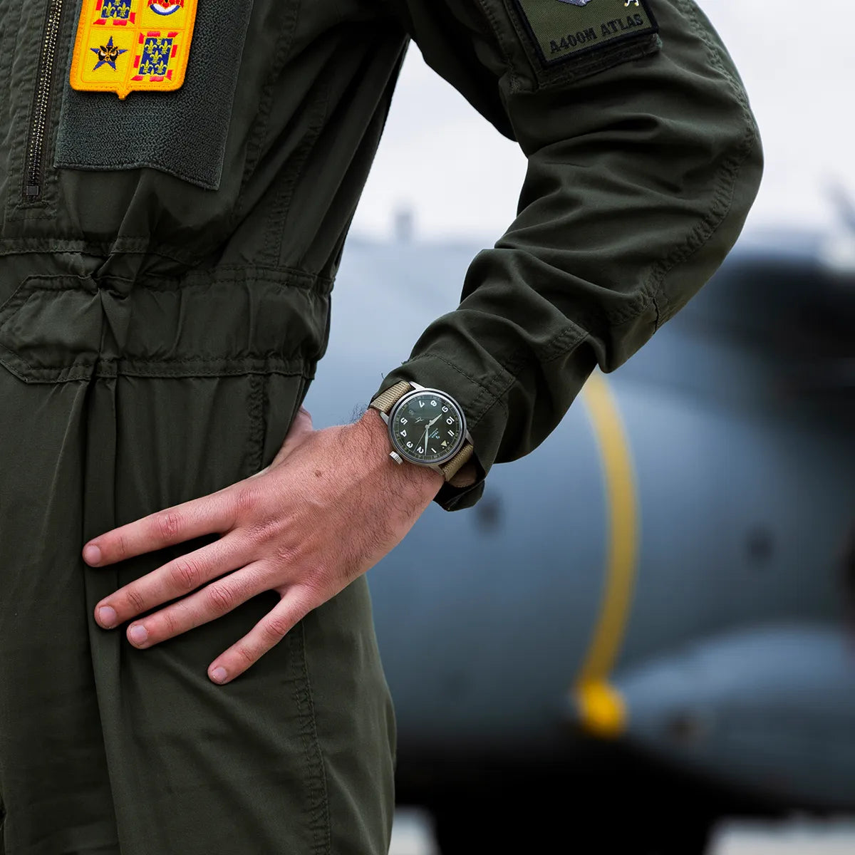 Designed and developed in collaboration with the French Air Force, the Flygraf Flieger is inspired by legendary WW II pilots watches.