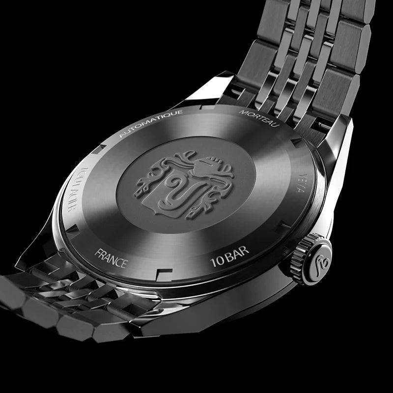 The great level of detail and finishes overall is also found on the steel case-back. Satin-polished and circular brushed finishes elegantly surround YEMA’s historic crest, which is carefully forged into the case-back with a hydraulic press, ensuring a qualitative and refined finishing.