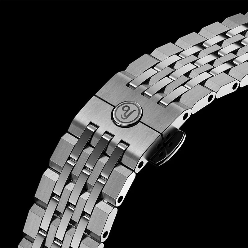 Specifically developed for the new Flygraf Pilot, this stainless steel bracelet multi-link architecture delivers both refined elegance and flexibility for everyday wear. The alternating brushed and polished surfaces create a subtle play of light, while the angular facets of the links echo the case lugs design for a cohesive aesthetic.