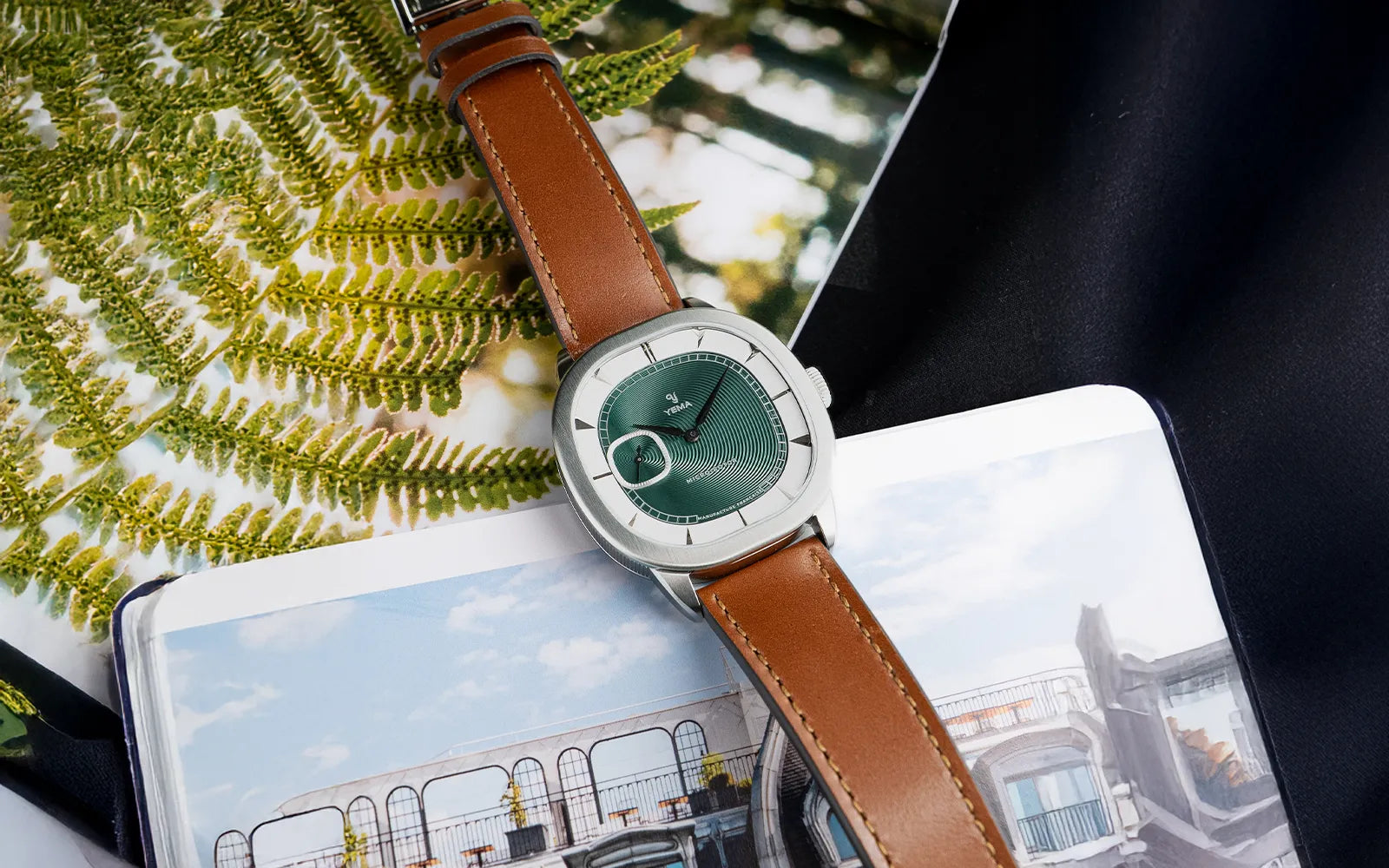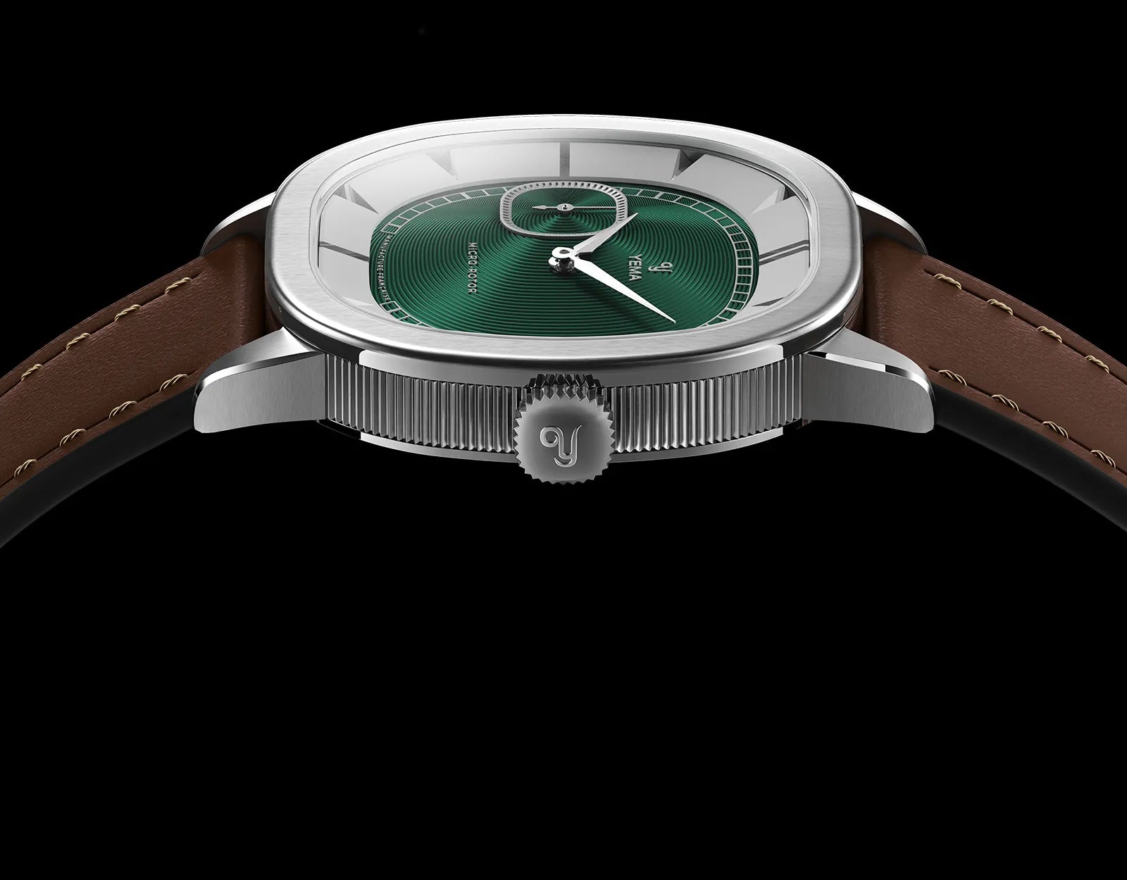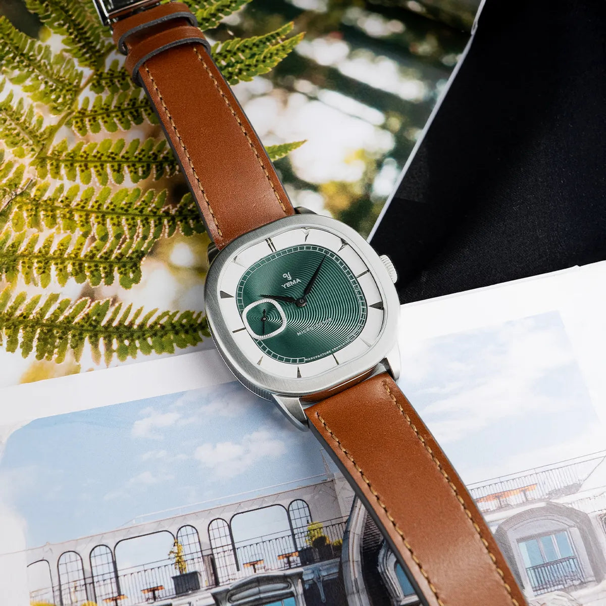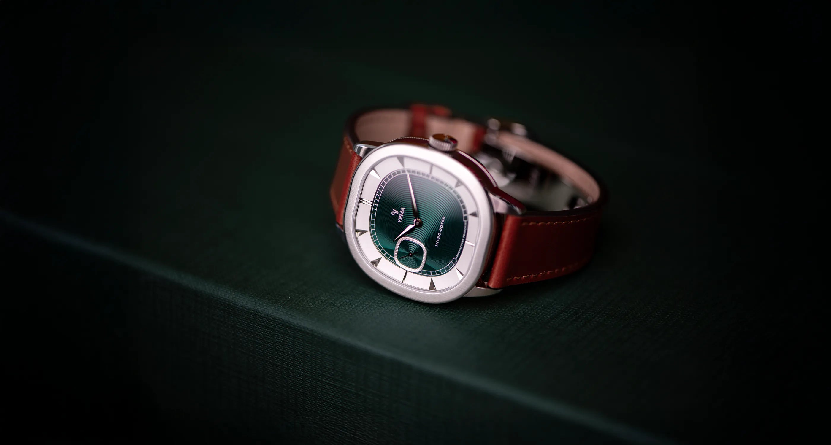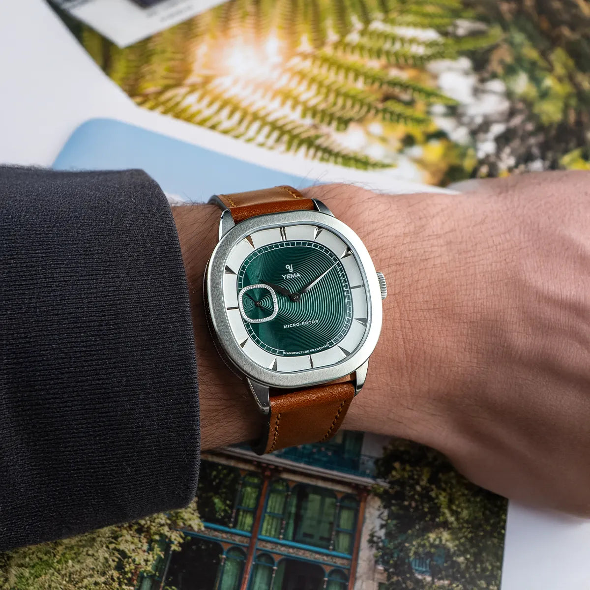 The 39mm cushion-shaped case draws inspiration from the arches of Grandvelle Palace in Besançon, the capital of the French watchmaking region where YEMA’s workshops are located.