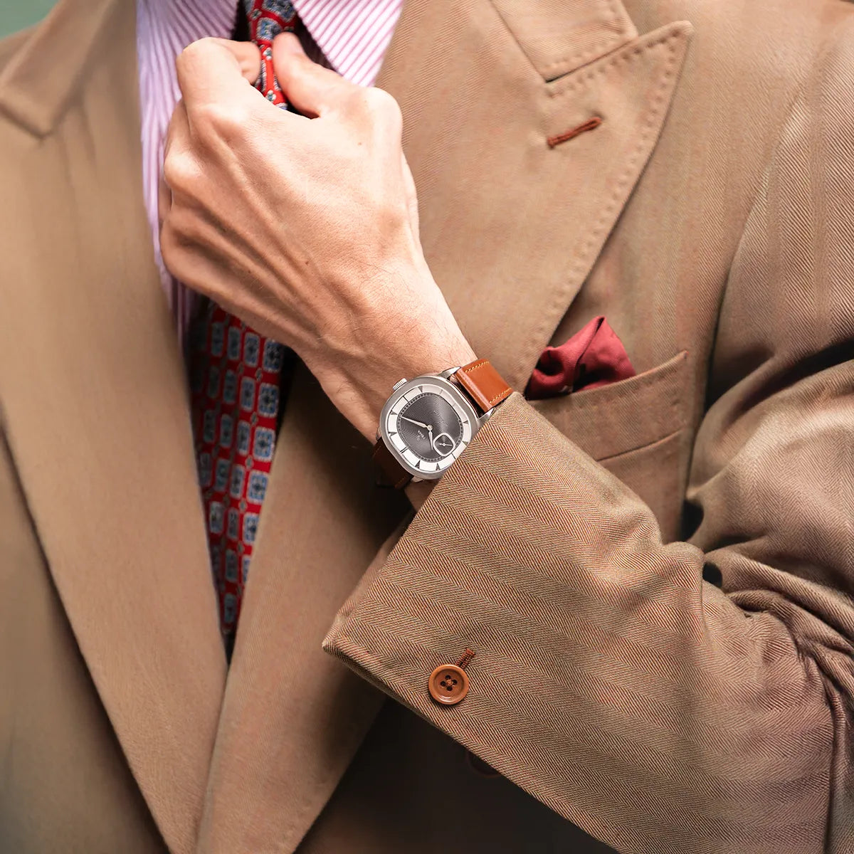 The Granvelle is paired with a premium leather strap with a gradual taper from the lug to the buckle, complete with contrasting beige stitching for a touch of sophistication. Elegant, durable, and fitted with a high-quality stainless steel deployant clasp, the strap complements the case’s tones while offering enduring comfort for everyday wear.