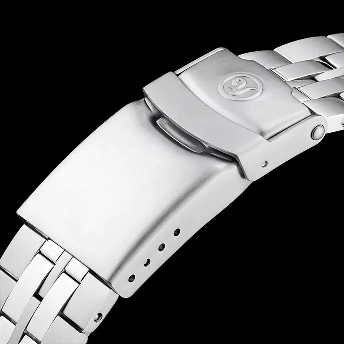 The 316L stainless steel deployment clasp adds style and comfort with its brushed finishes. The steel bracelet has an extension so that it can be easily and quickly adjusted over a diving suit.