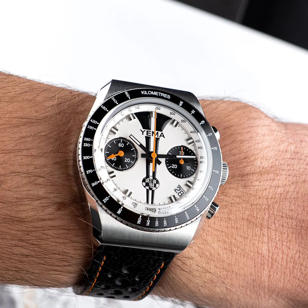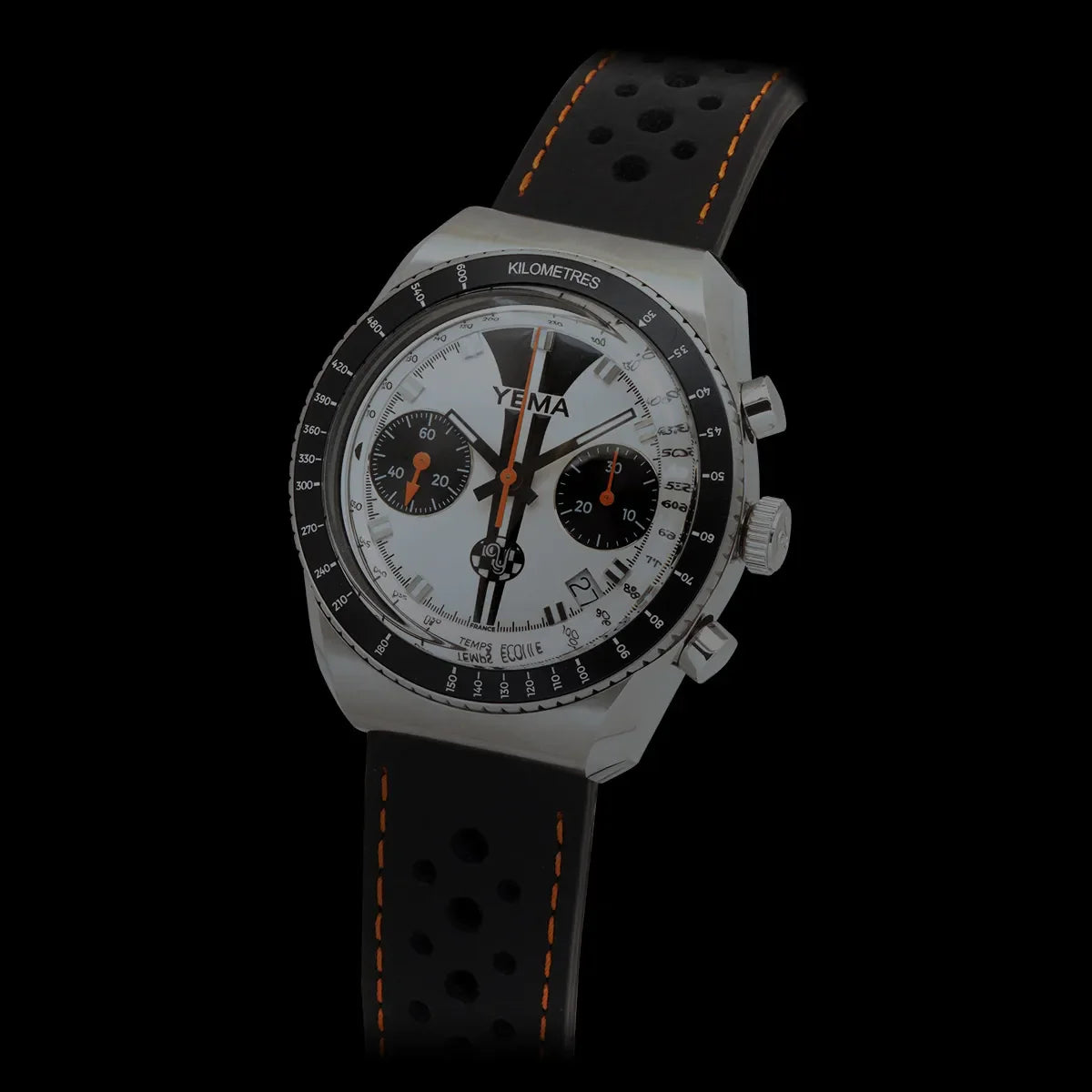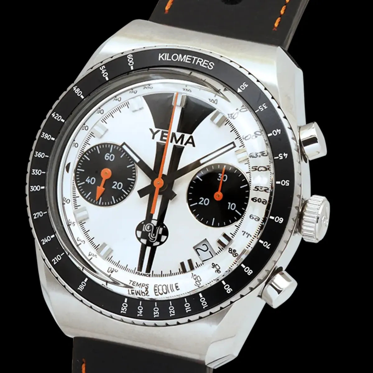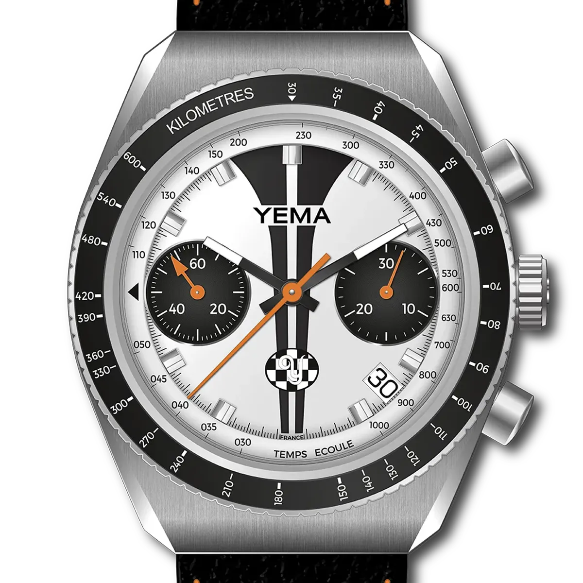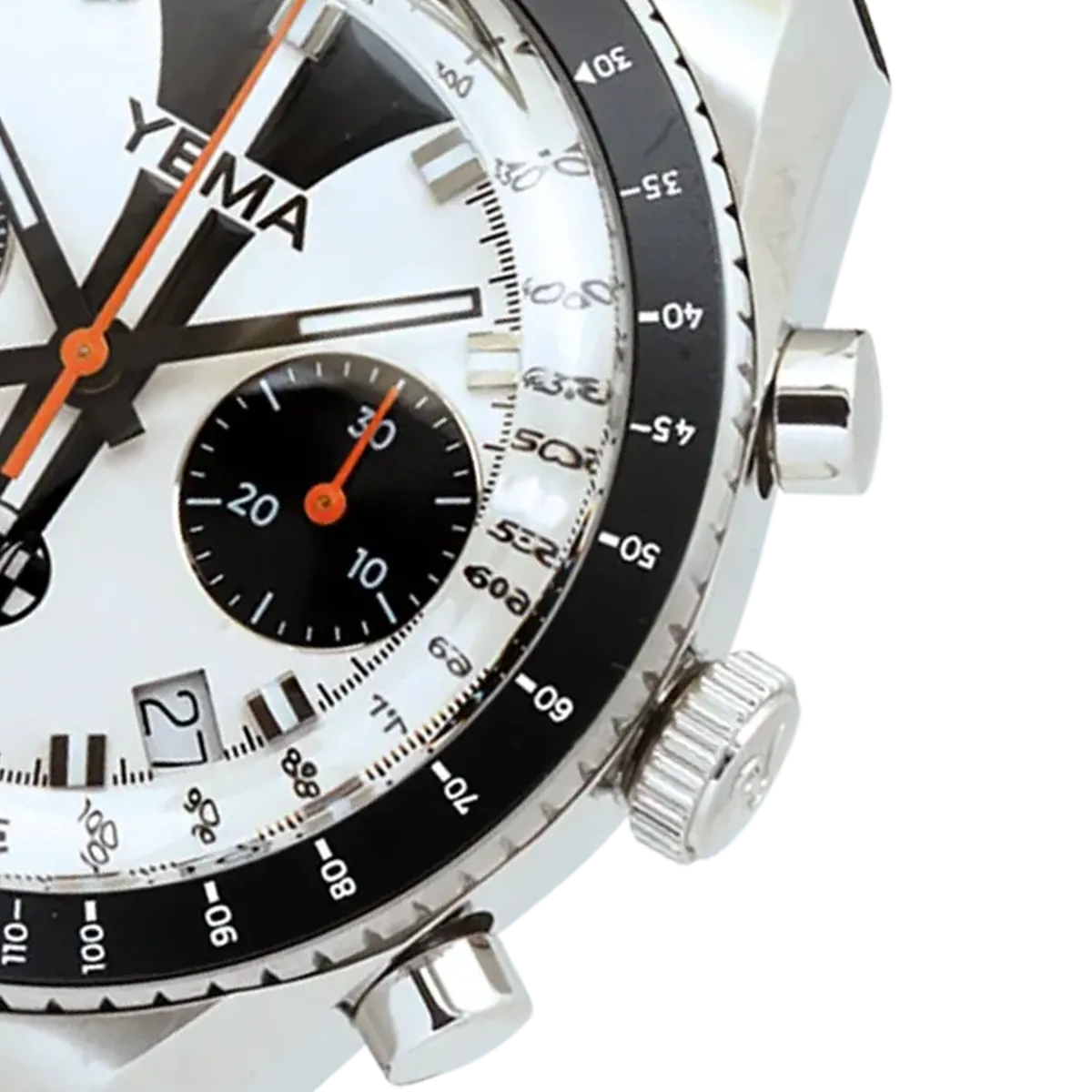 Enhanced racing look for this bi-compax chronograph, its panda dial and the stylized Y of YEMA surrounded by a checkerboard pattern. The orange color of the hands contrasts with the black and white dial.