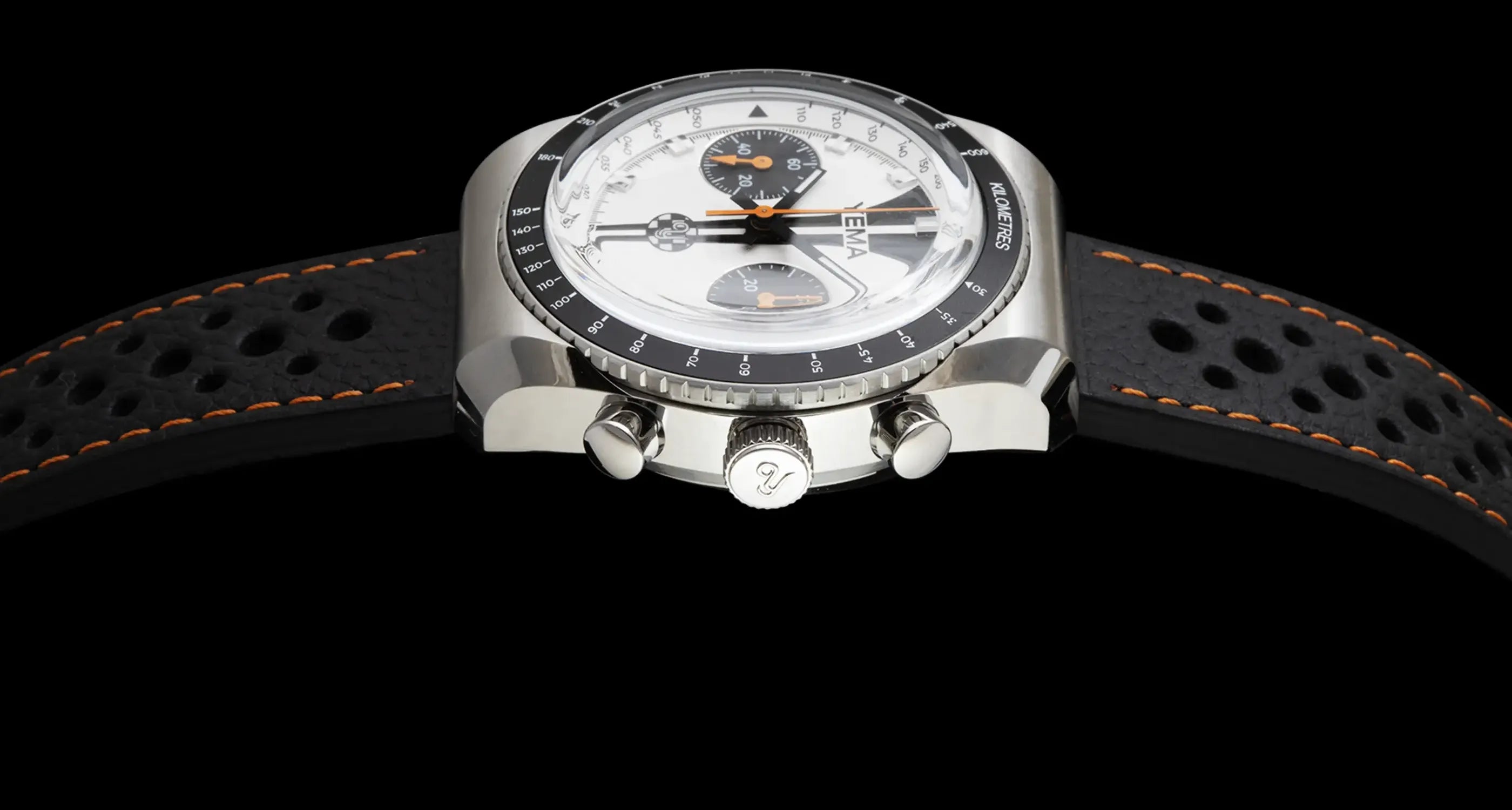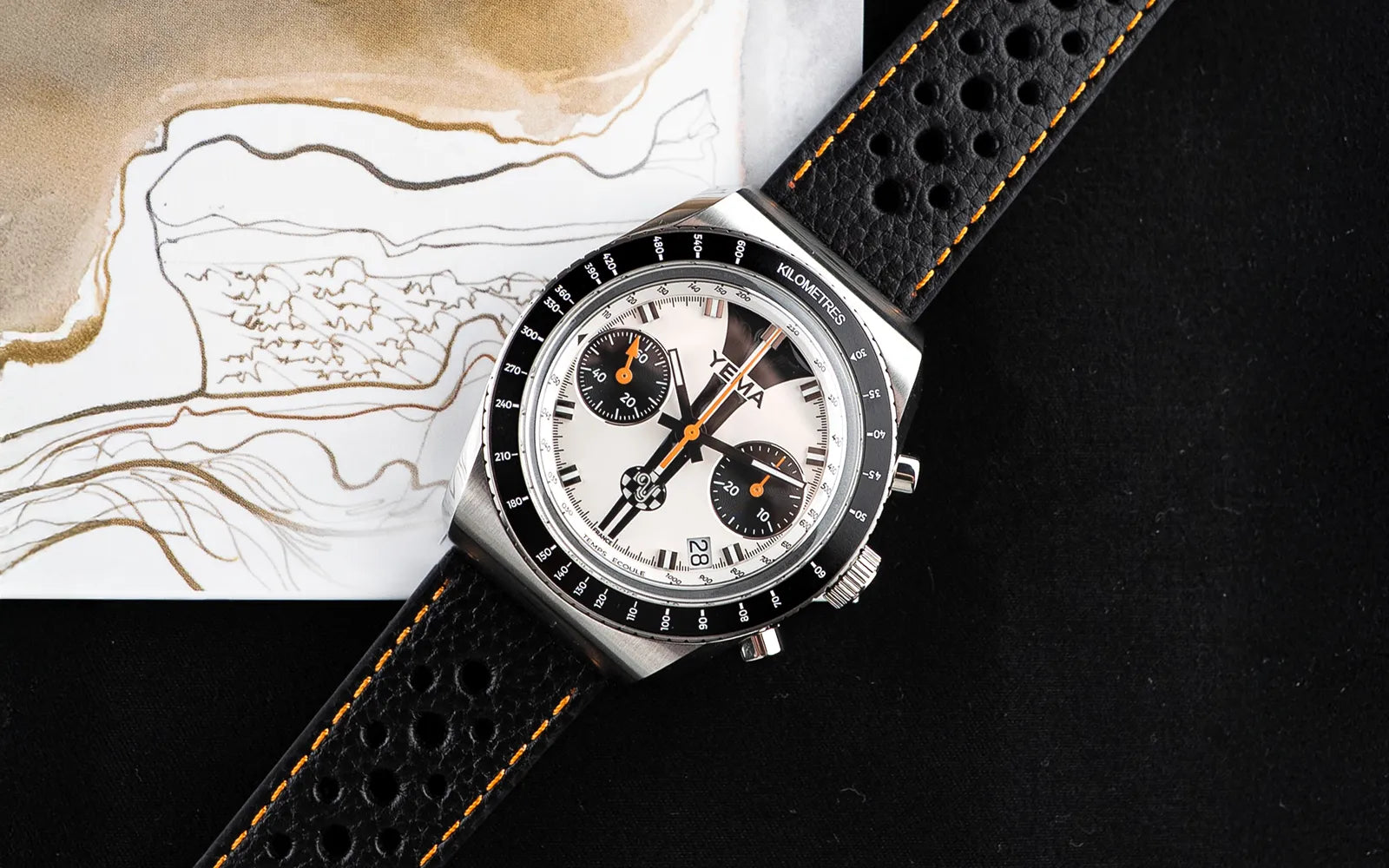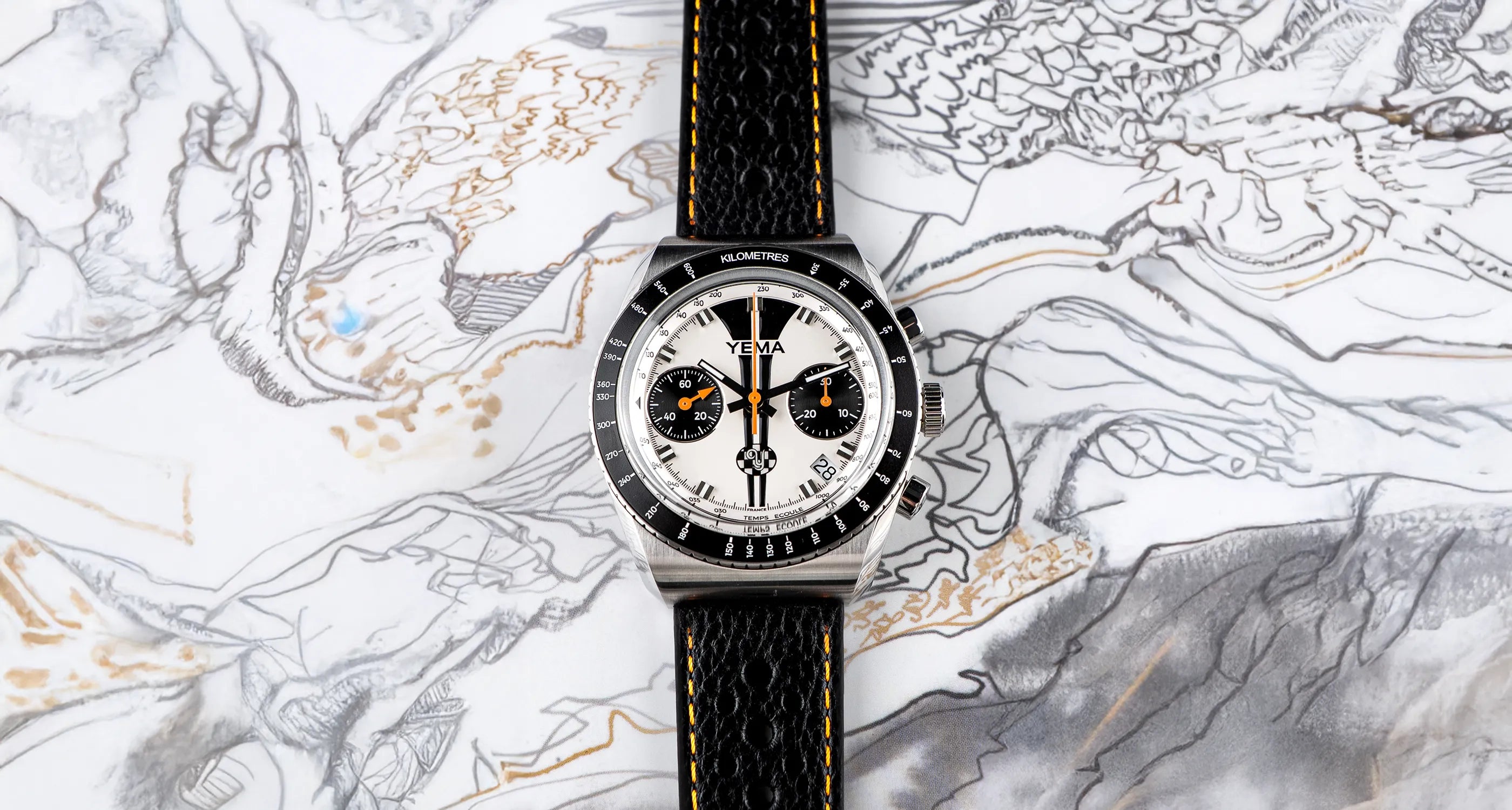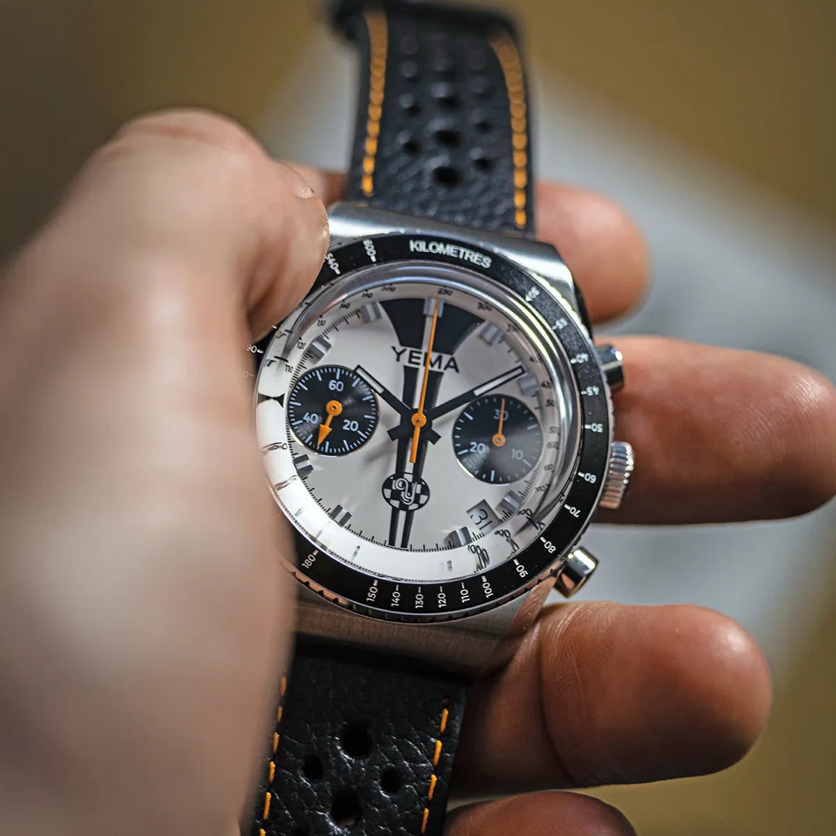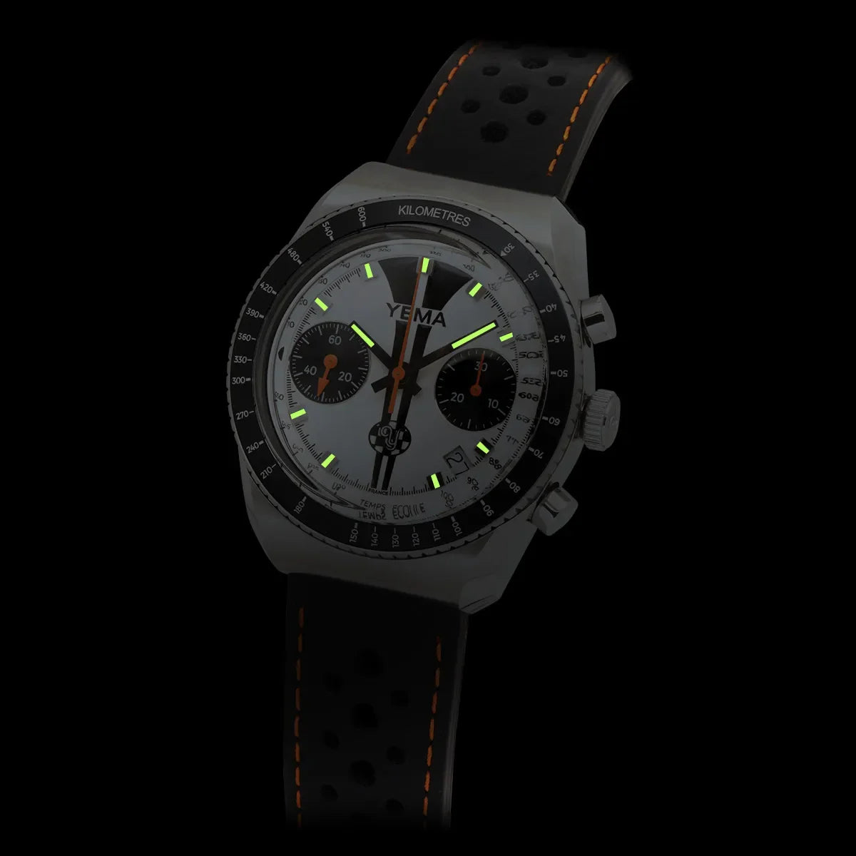 Enhanced racing look for this bi-compax chronograph, its panda dial and the stylized Y of YEMA surrounded by a checkerboard pattern. The orange color of the hands contrasts with the black and white dial.