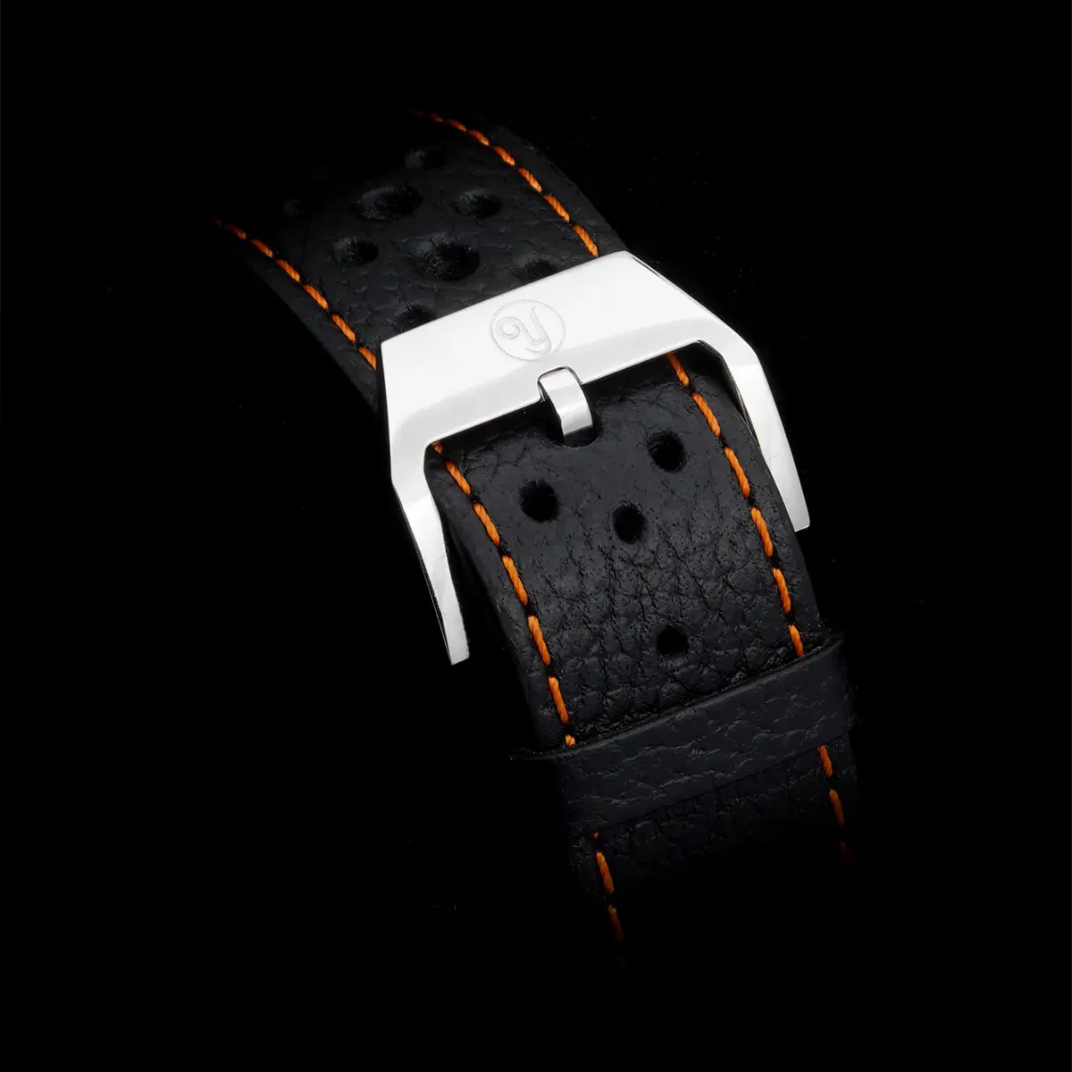 Made by a French straps craftsman from our region (Franche-Comté), the Rallye strap is made in grained, perforated leather with orange topstitching to match the hands. The polished steel buckle is engraved with YEMA’s logo.