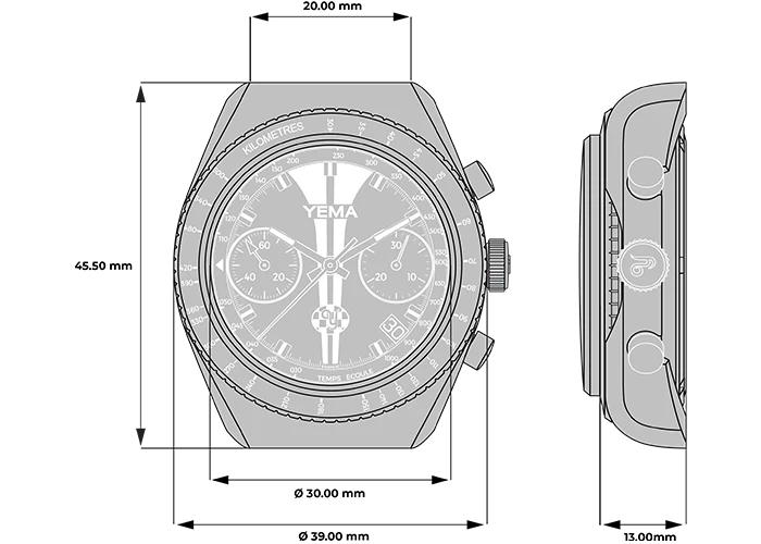 In the early 1970s, YEMA presented a chronograph model specifically designed for motor racing with a unique integrated bezel design. This chronograph equipped with an ETA Valjoux 7753 caliber makes it possible to measure the average speed using the bezel/dial marking and is aimed at motorsport enthusiasts and all gentlemen drivers around the world.