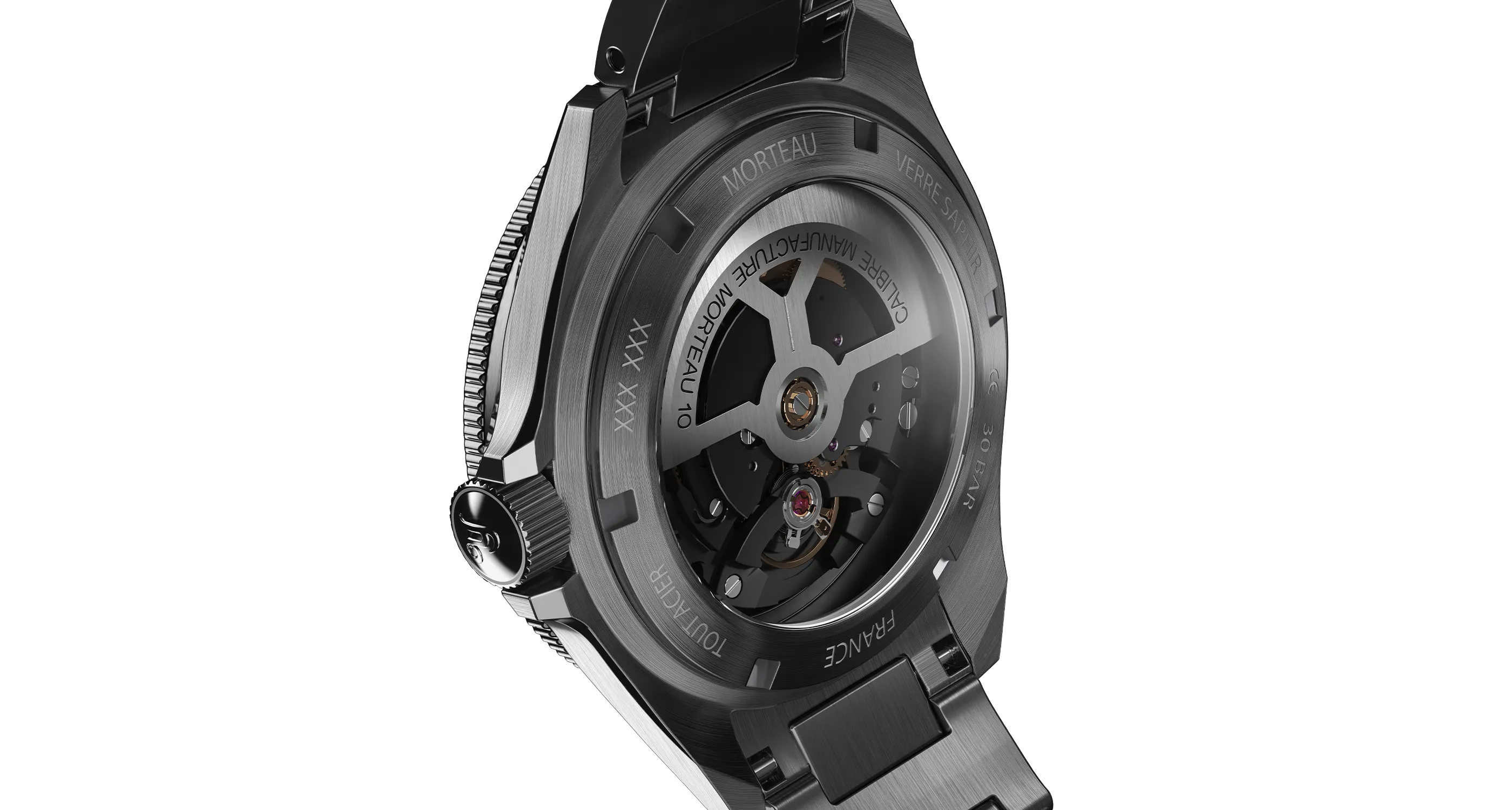 The exhibition case back in sapphire crystal reveals the CMM.10 Manufacture caliber while preserving a 30 BAR (300m/990 feet) water resistance.