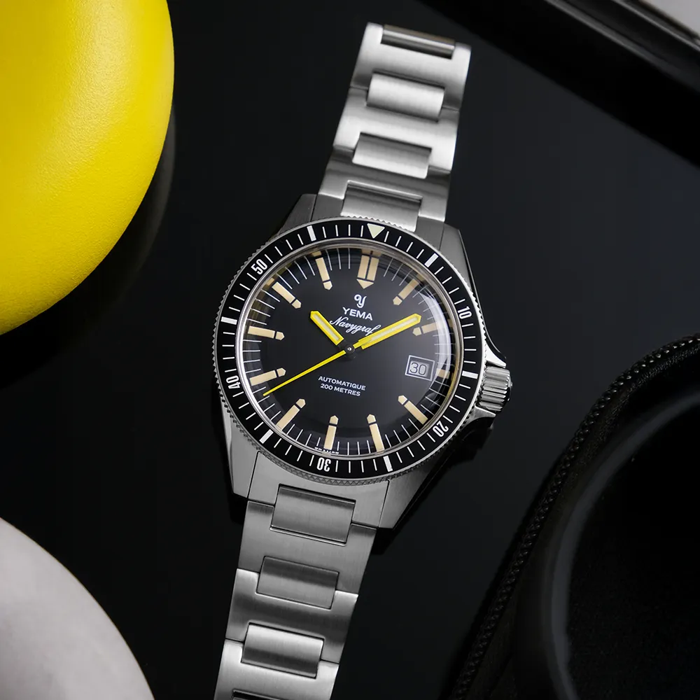 At its heart are the striking yellow hands, a hallmark of the Navygraf’s identity, designed to ensure absolute clarity and instant legibility in any conditions. Surrounding them, the dial is punctuated by the unmistakable exclamation point hour markers, a playful yet iconic design signature that has made this watch instantly recognizable for generations, while reintroducing another nod to the past: the date complication.