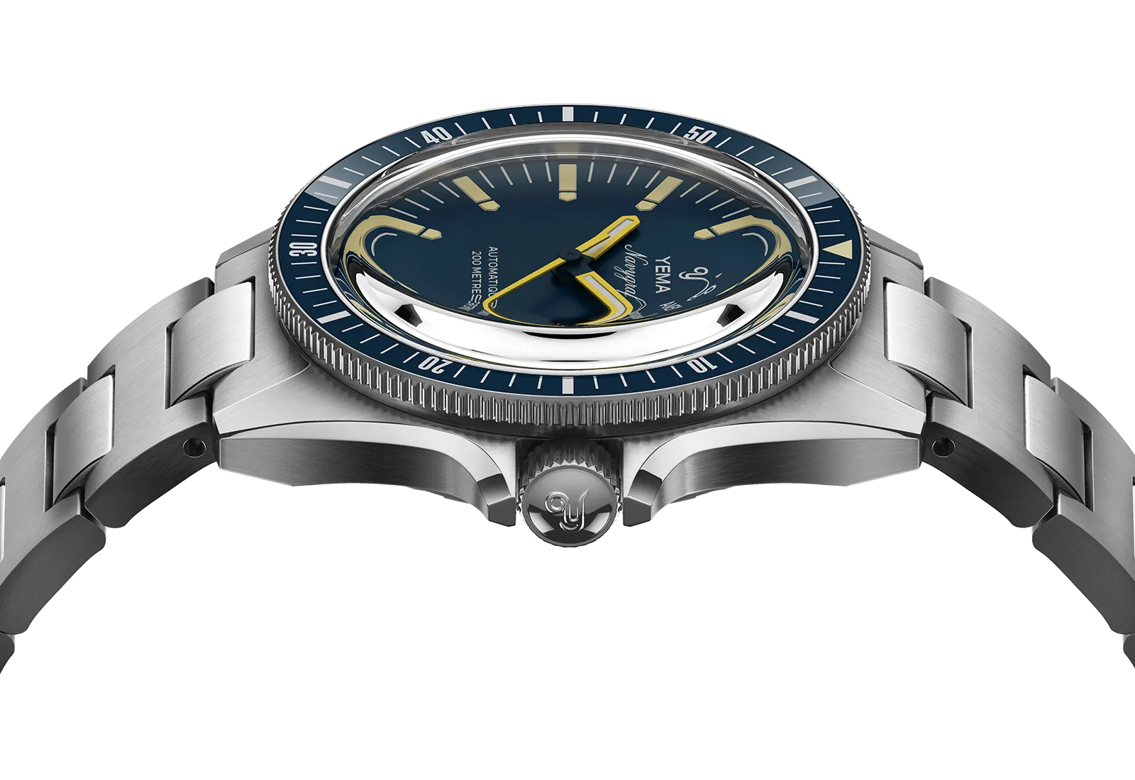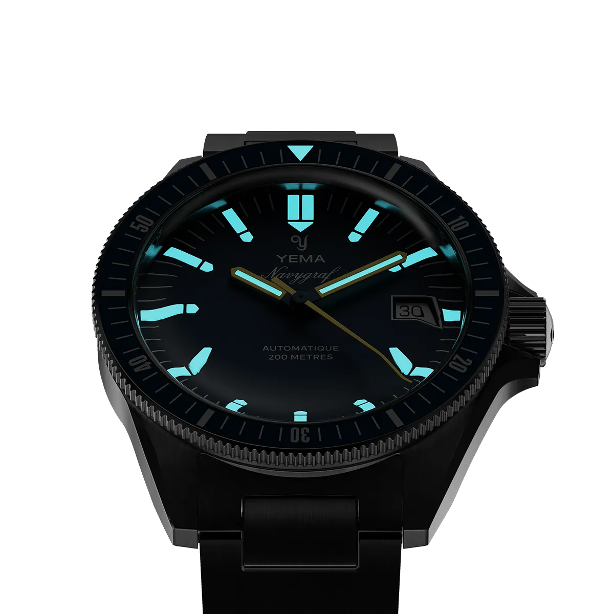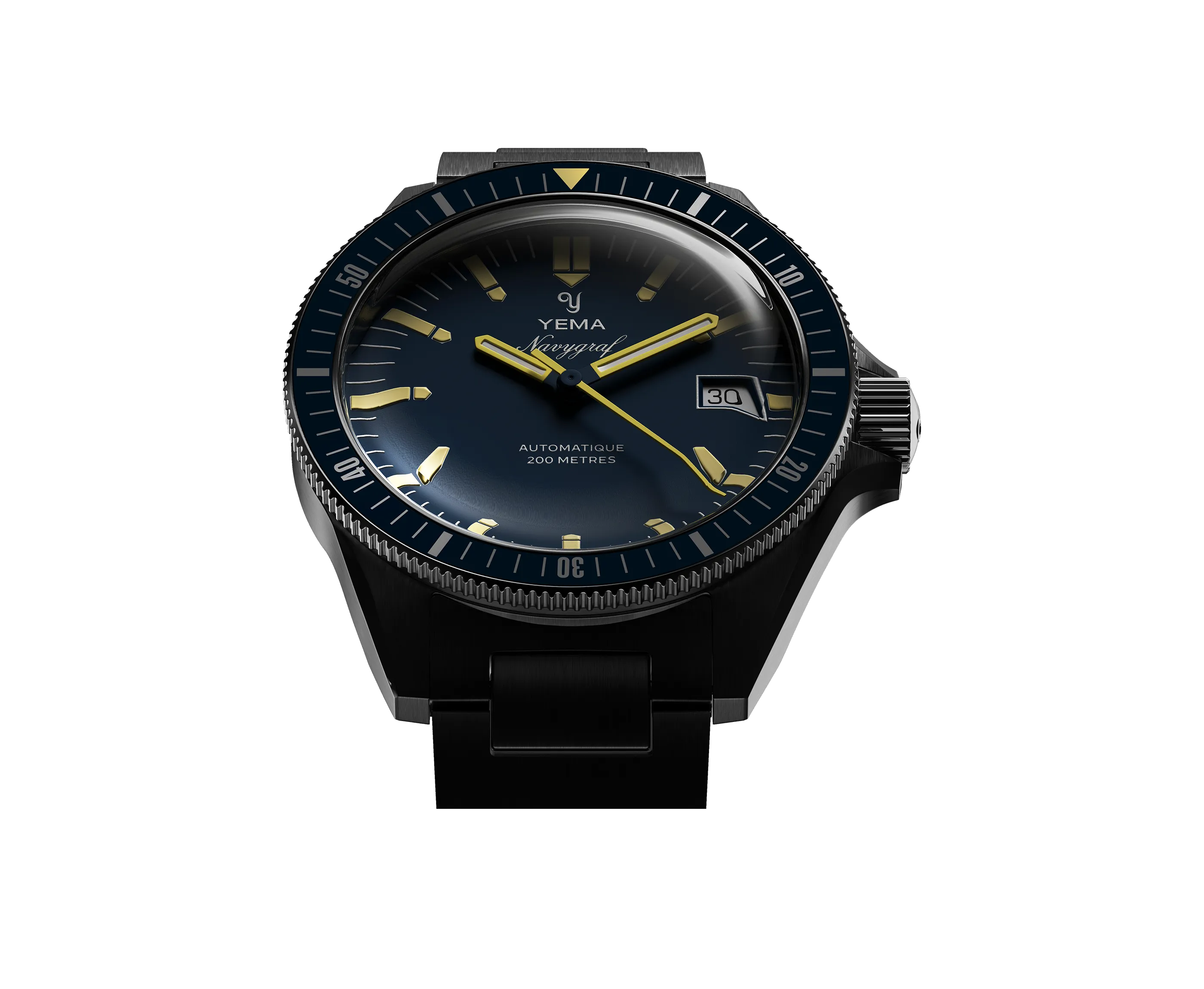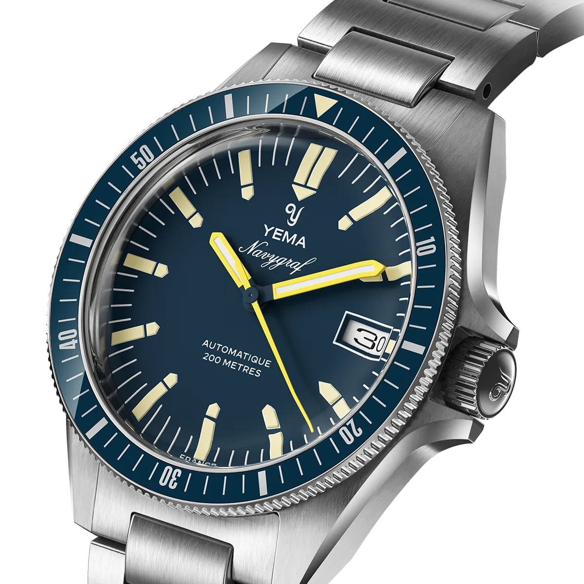 At its heart are the striking yellow hands, a hallmark of the Navygraf’s identity, designed to ensure absolute clarity and instant legibility in any conditions. Surrounding them, the dial is punctuated by the unmistakable exclamation point hour markers, a playful yet iconic design signature that has made this watch instantly recognizable for generations, while reintroducing another nod to the past: the date complication.