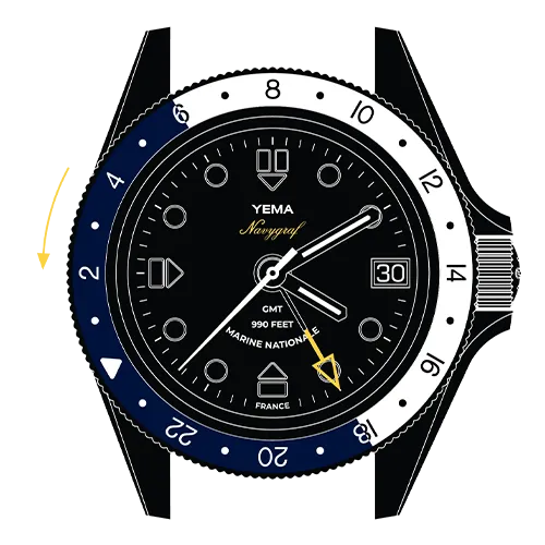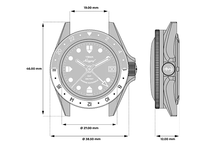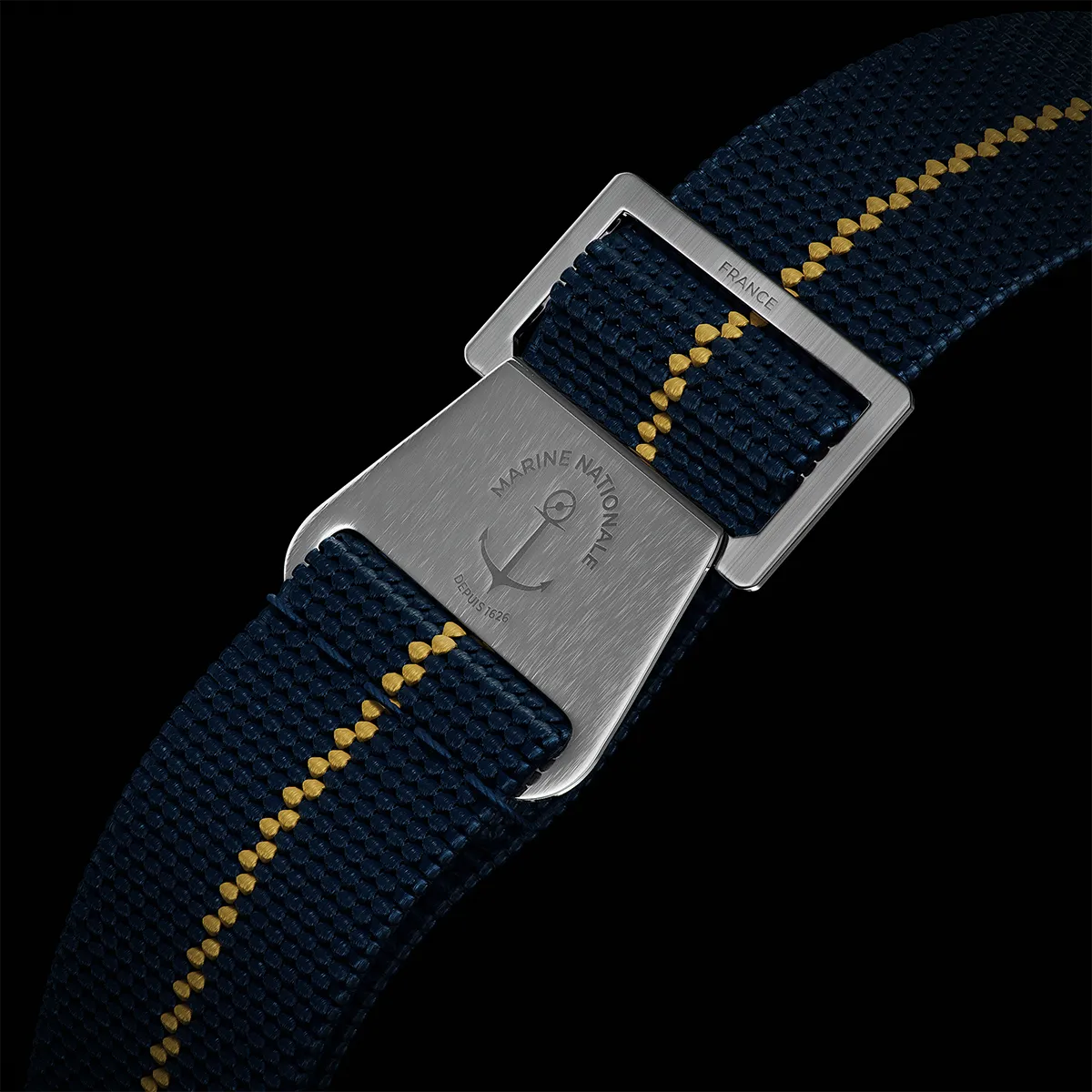 The dial inspires from the 1970s Navygraf II and features raised hour markers in polished steel matching the hands and providing additional depth to the dial. The white hour markers and hands, in contrast with the Navy blue dial, ensure high readabilty in all circumstances. The sweeping hand, GMT hand and Navygraf's logo are gracefully highlighted in yellow. Official French Navy watch with Marine Nationale mention at 6 o'clock.