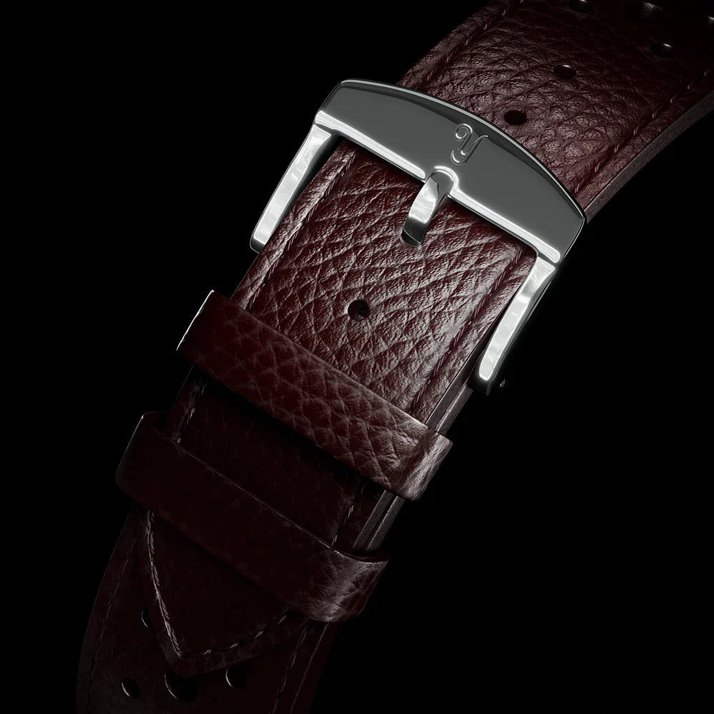 Made by a French manufacturer from our region (Franche Comté) and designed for motorsport amateurs, our perforated grained leather straps inspire from vintage car steering wheels and driving gloves and are the perfect companion for classic chronographs.