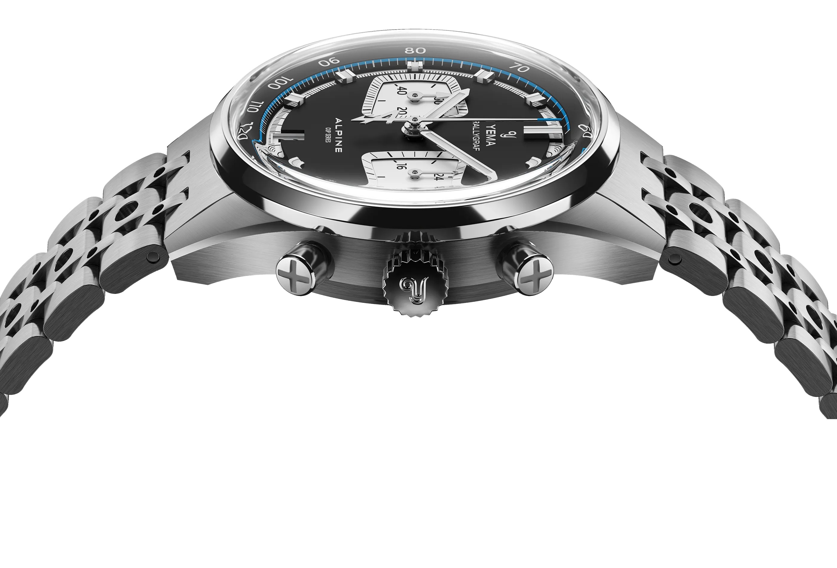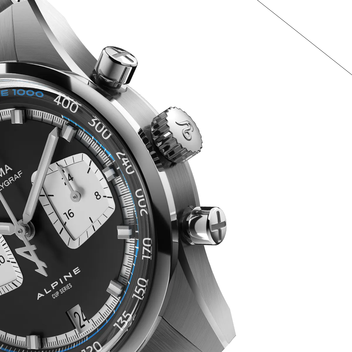 This timeless design not only enhances legibility, allowing each counter to be read at a glance, but also adds visual depth and sporty elegance. The date is balanced off at 6 o'clock position in tandem with the Alpine Elf Cup Series logo on the top to accentuate its racing theme. Spot the Alpine blue tip on the central second hand which points clearly to the bezel marked with the tachymeter scale.