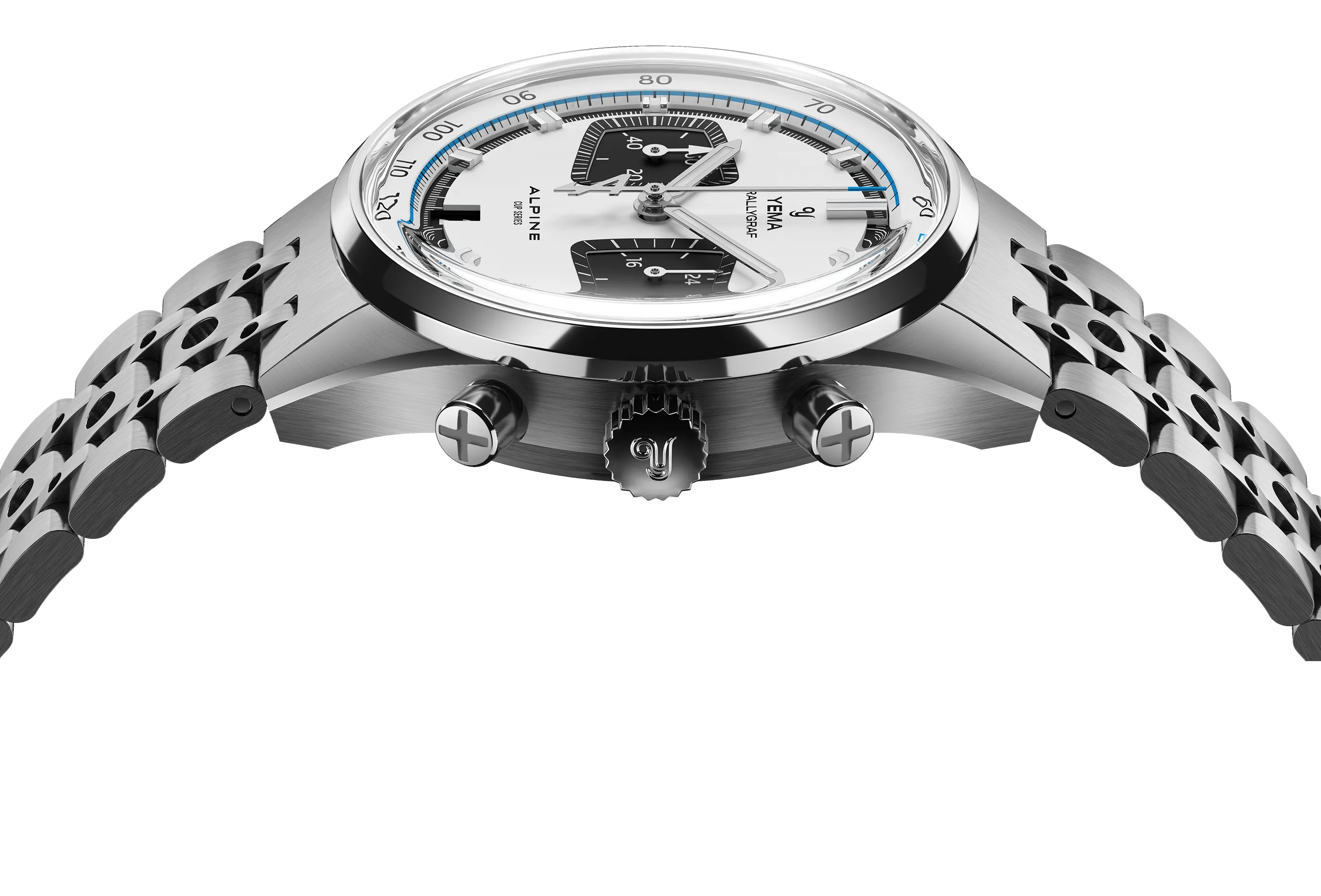Specially conceived for the Rallygraf Alpine Elf Cup Series, the YEMA Rally steel bracelet stands out with its distinctive perforated design, inspired by vintage motorsport racing gloves. Crafted entirely from stainless steel in brushed finish, it blends sporty character and neo-vintage charm, perfectly complementing the chronograph’s racing DNA. The bracelet gently tapers toward the clasp for enhanced comfort and a more elegant wrist presence, while its integrated steel folding clasp has a safety catch for a secure and comfortable fit when wearing.