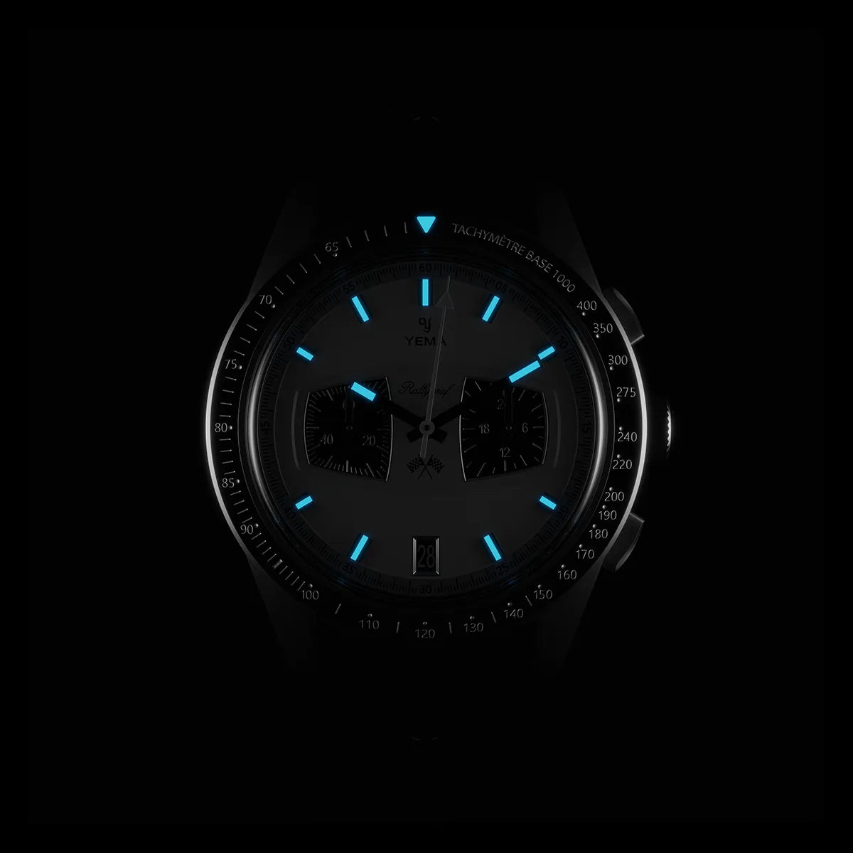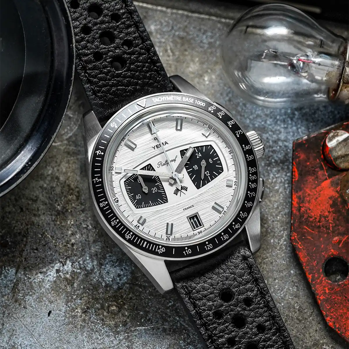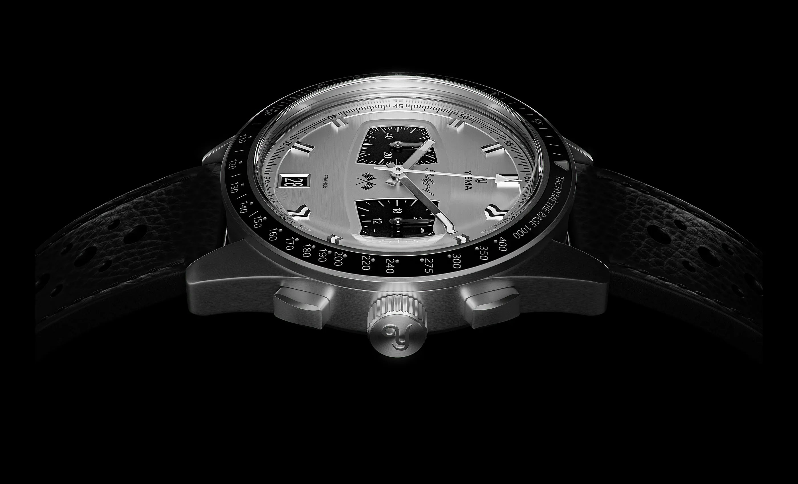 The iconic Rallygraf preserves the pure design tradition of YEMA chronographs with sub-registers reminiscent of vintage race car dashboards.