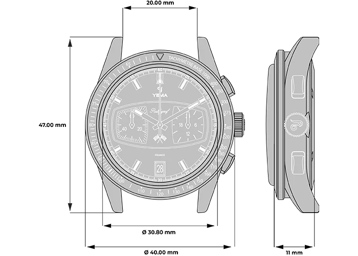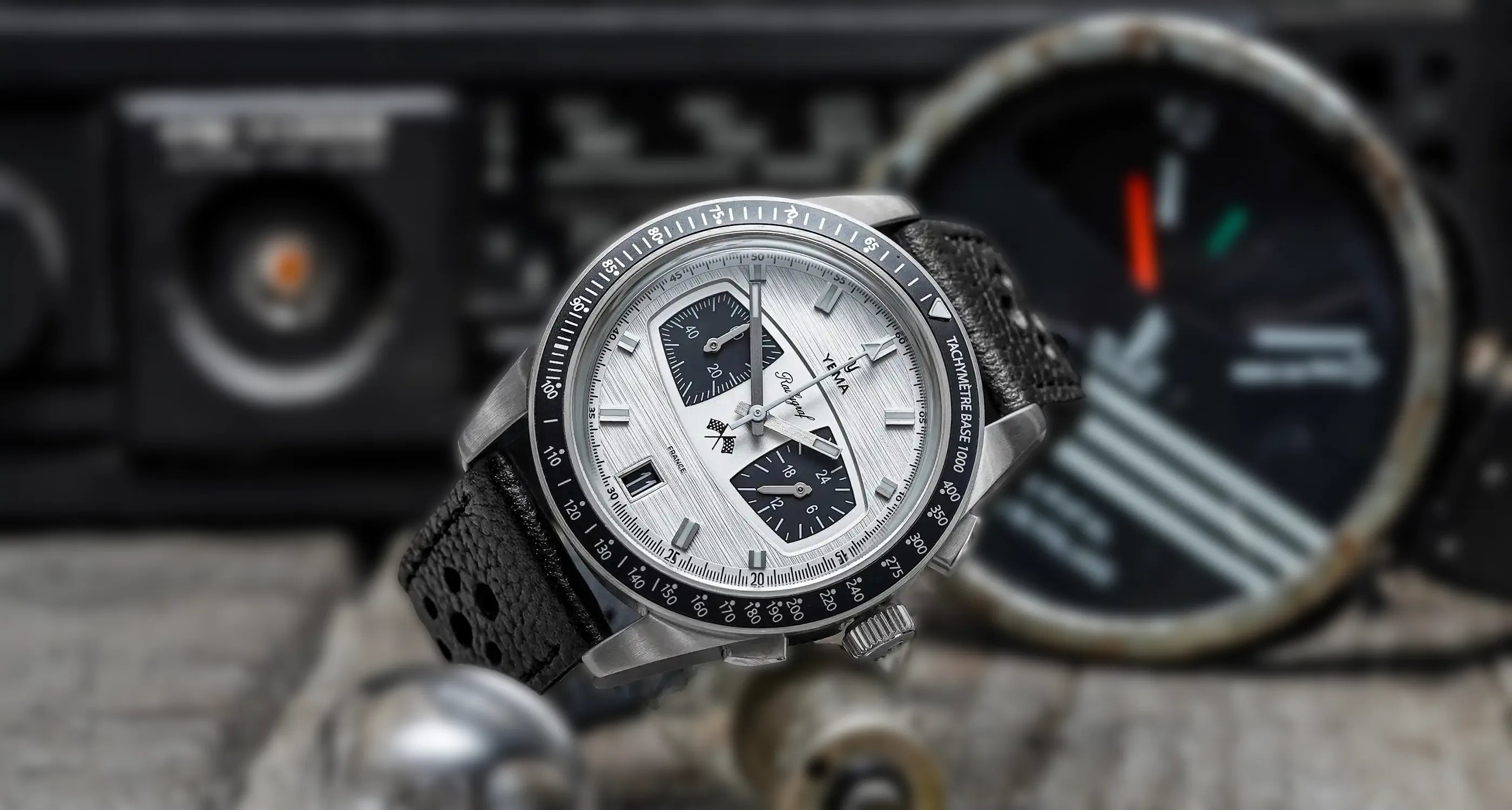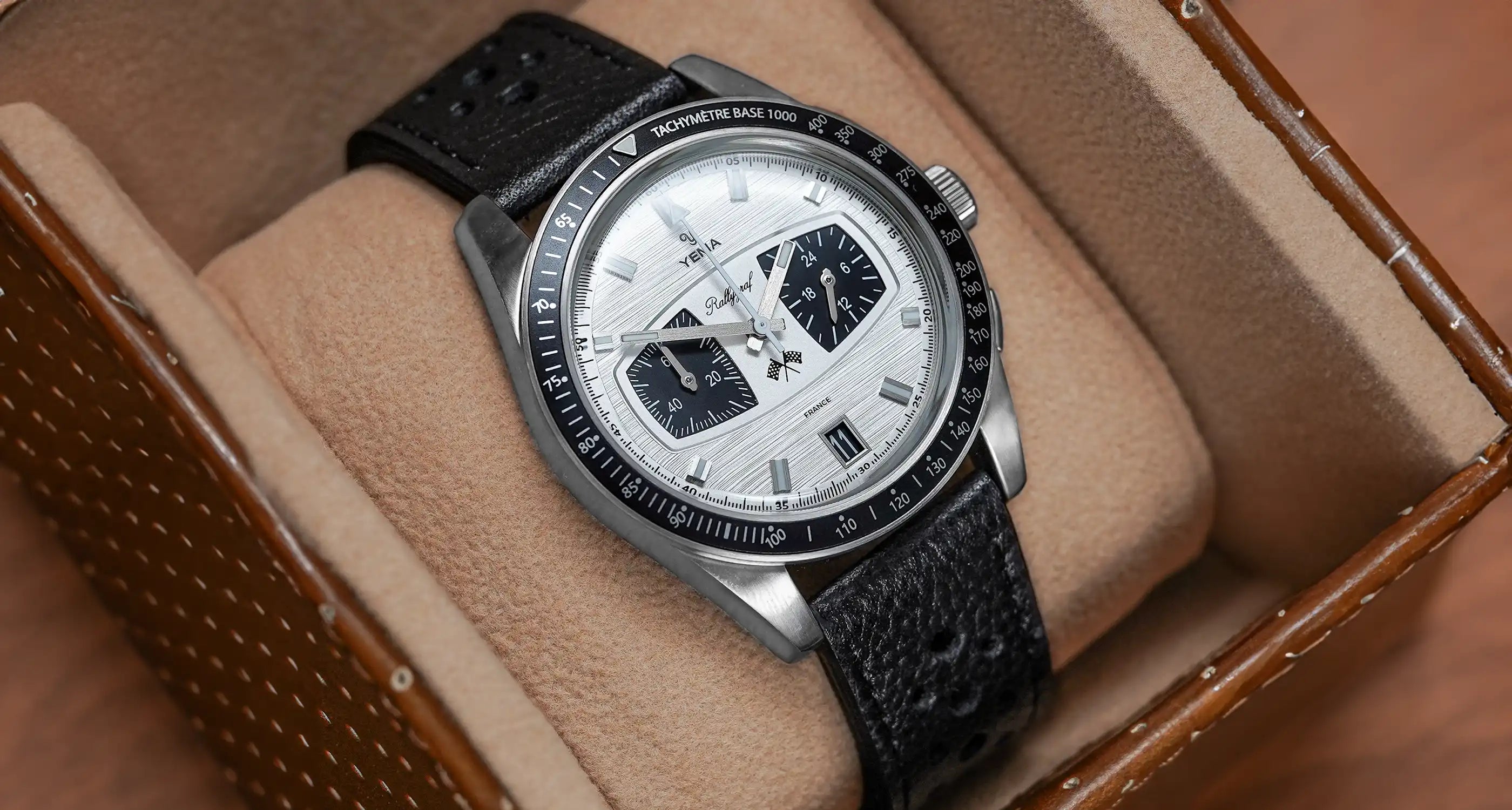 The iconic Rallygraf preserves the pure design tradition of YEMA chronographs with sub-registers reminiscent of vintage race car dashboards.