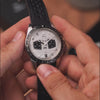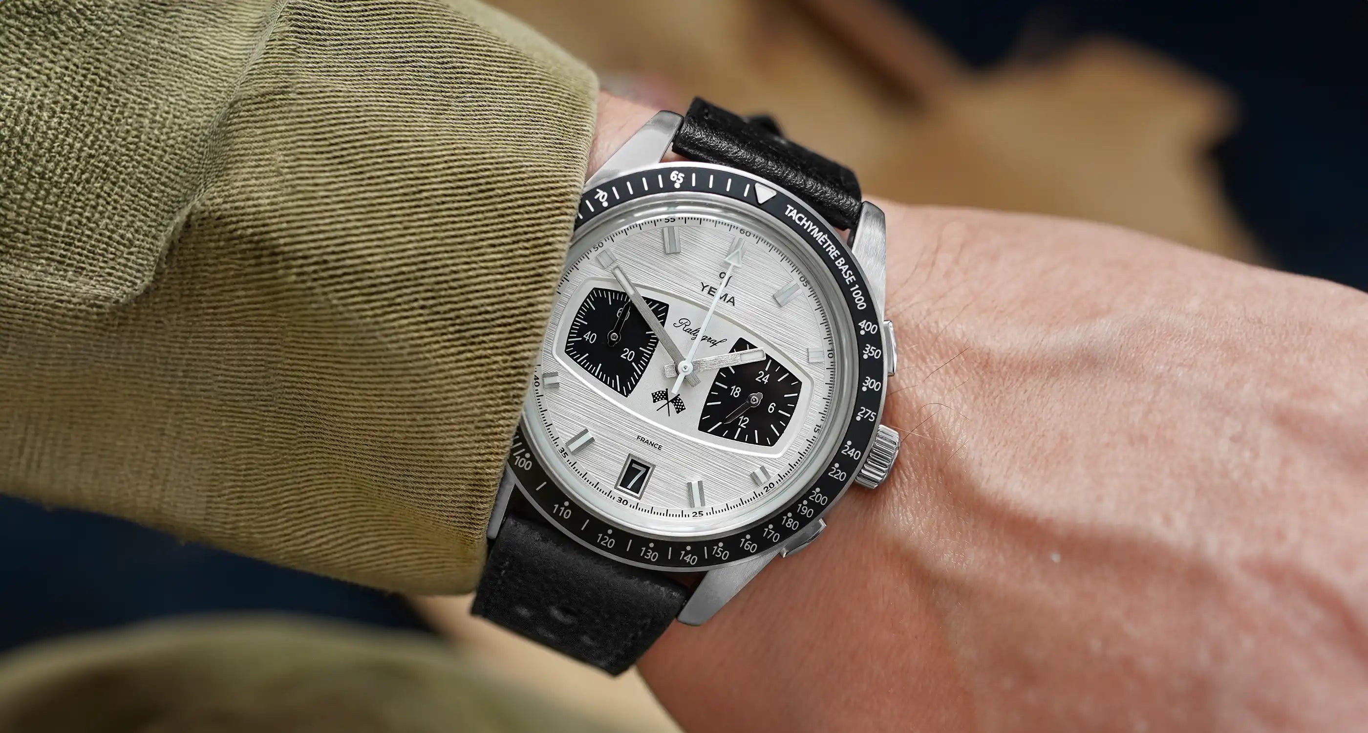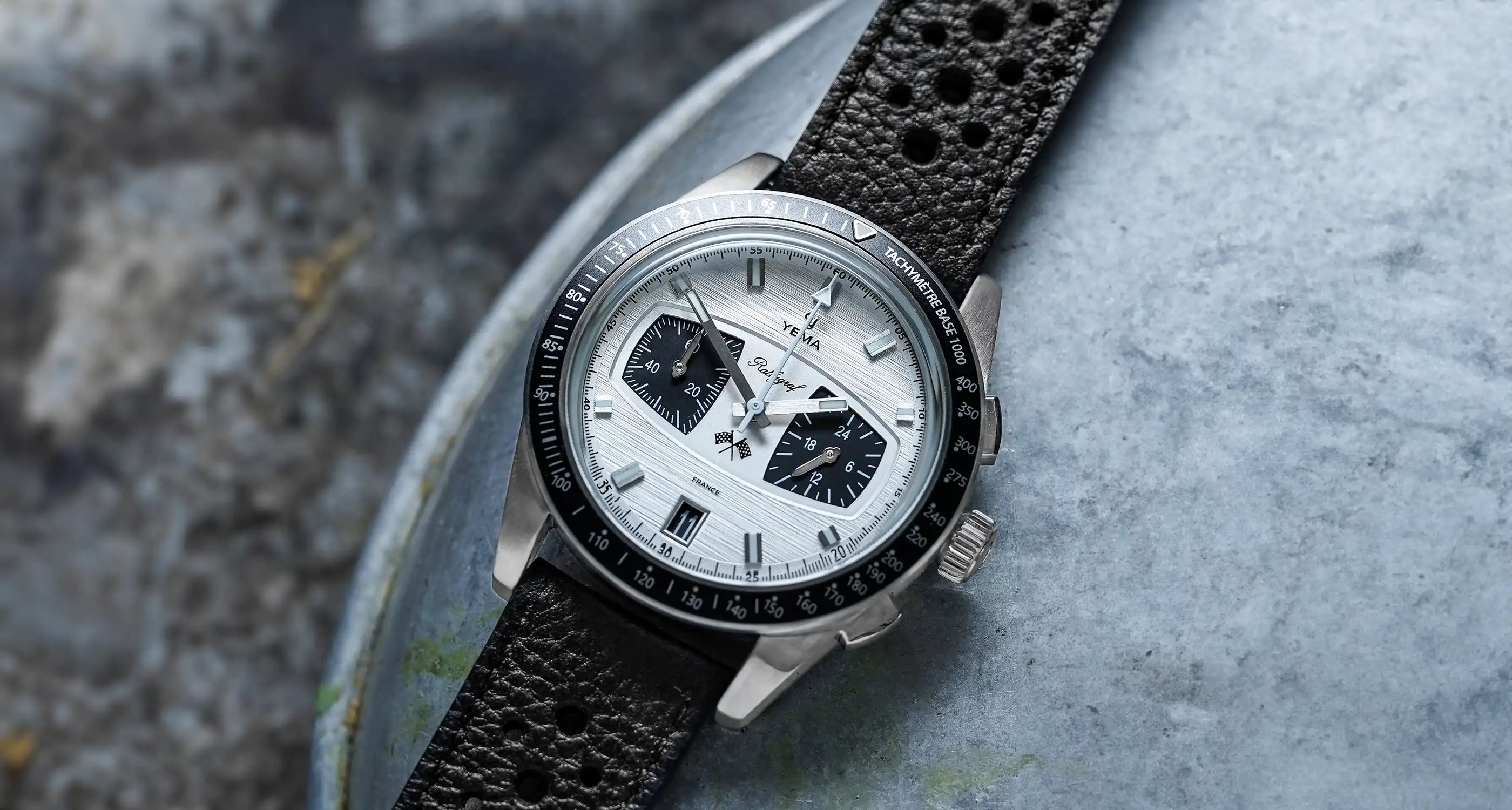 This new edition is a contemporary take on YEMA’s legendary motorsports chronograph worn by legends like Mario Andretti. It features a completely redesigned steel case, block pushers and a textured dial reminiscent of vintage race car dashboards. The date, time and chronograph functions are powered by Seiko's VK64 hybrid caliber.