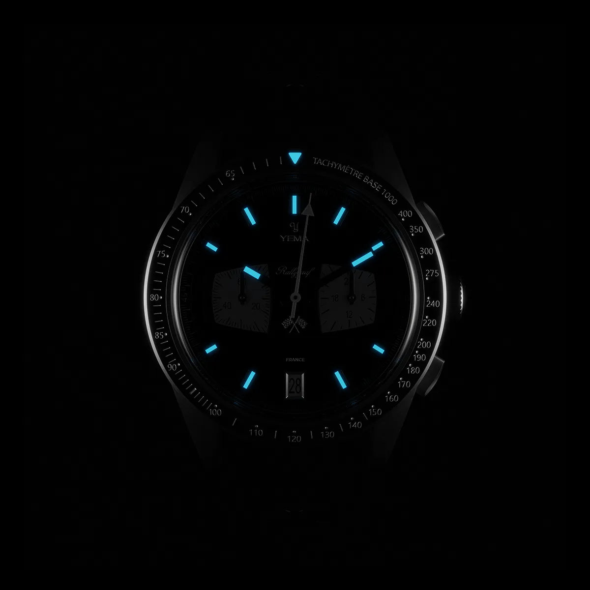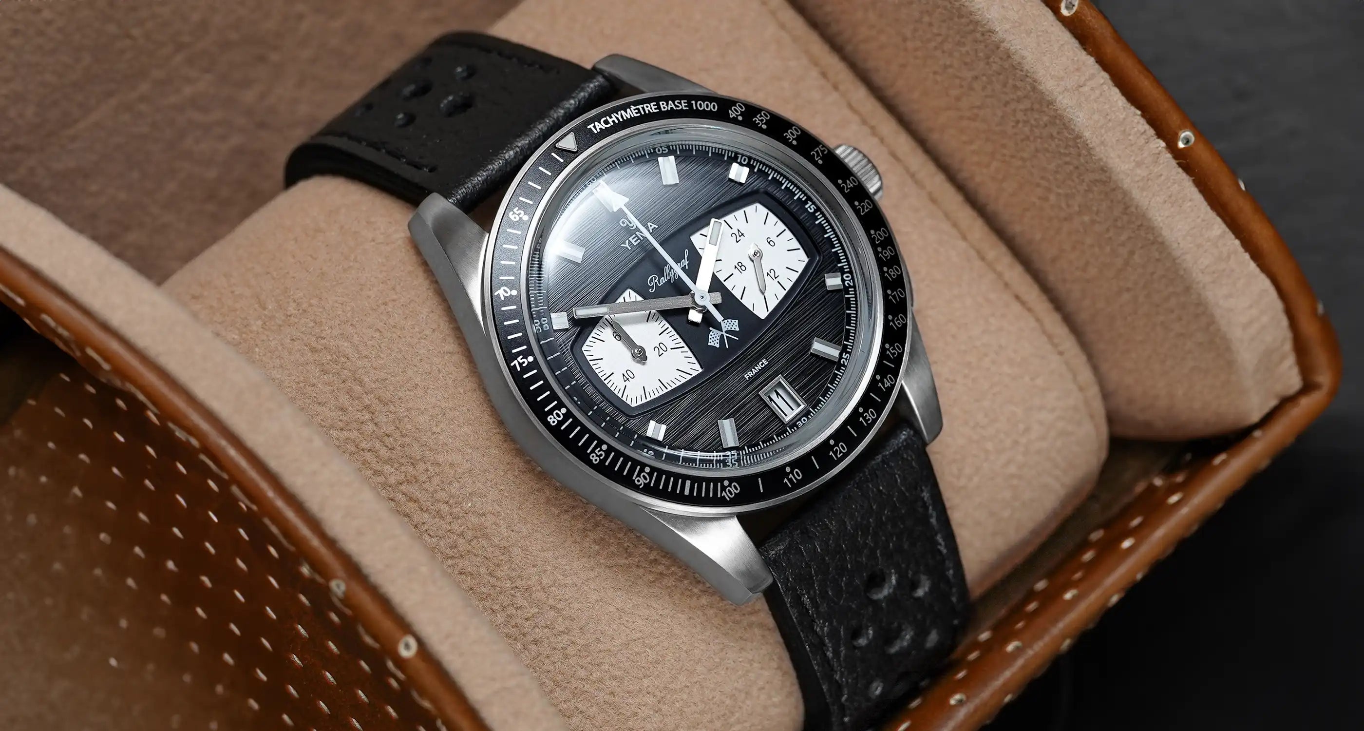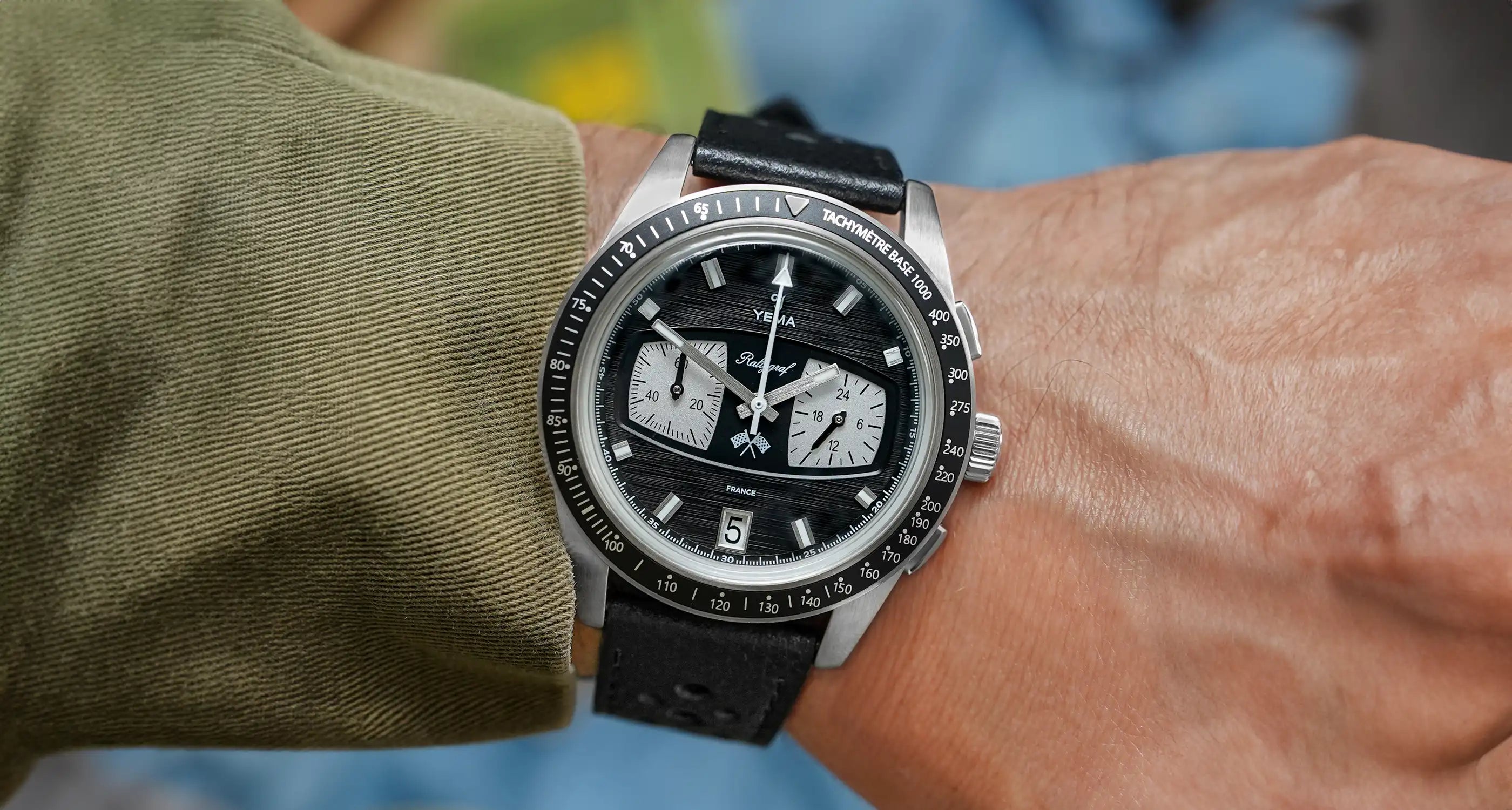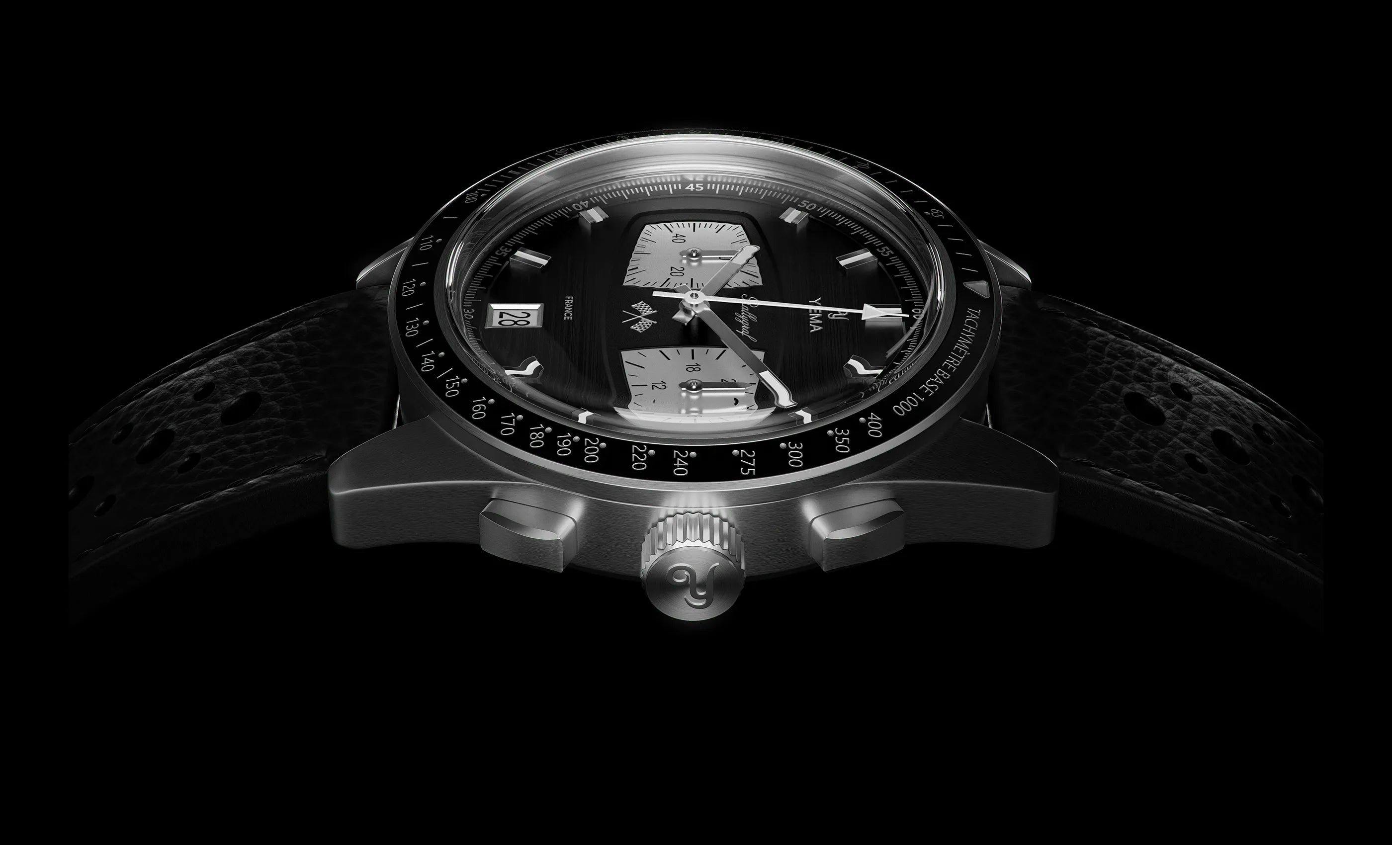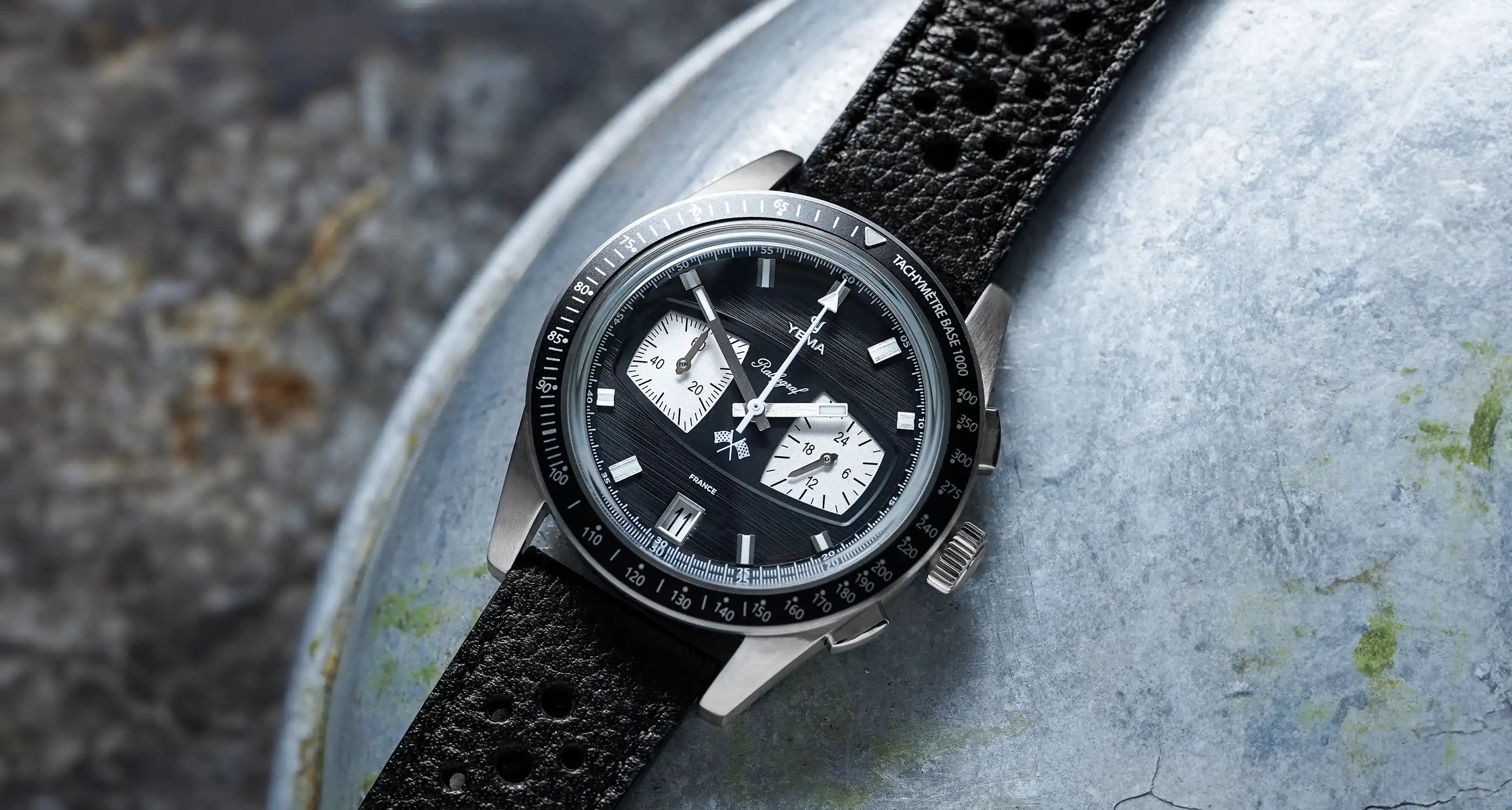 The iconic Rallygraf preserves the pure design tradition of YEMA chronographs with sub-registers reminiscent of vintage race car dashboards.