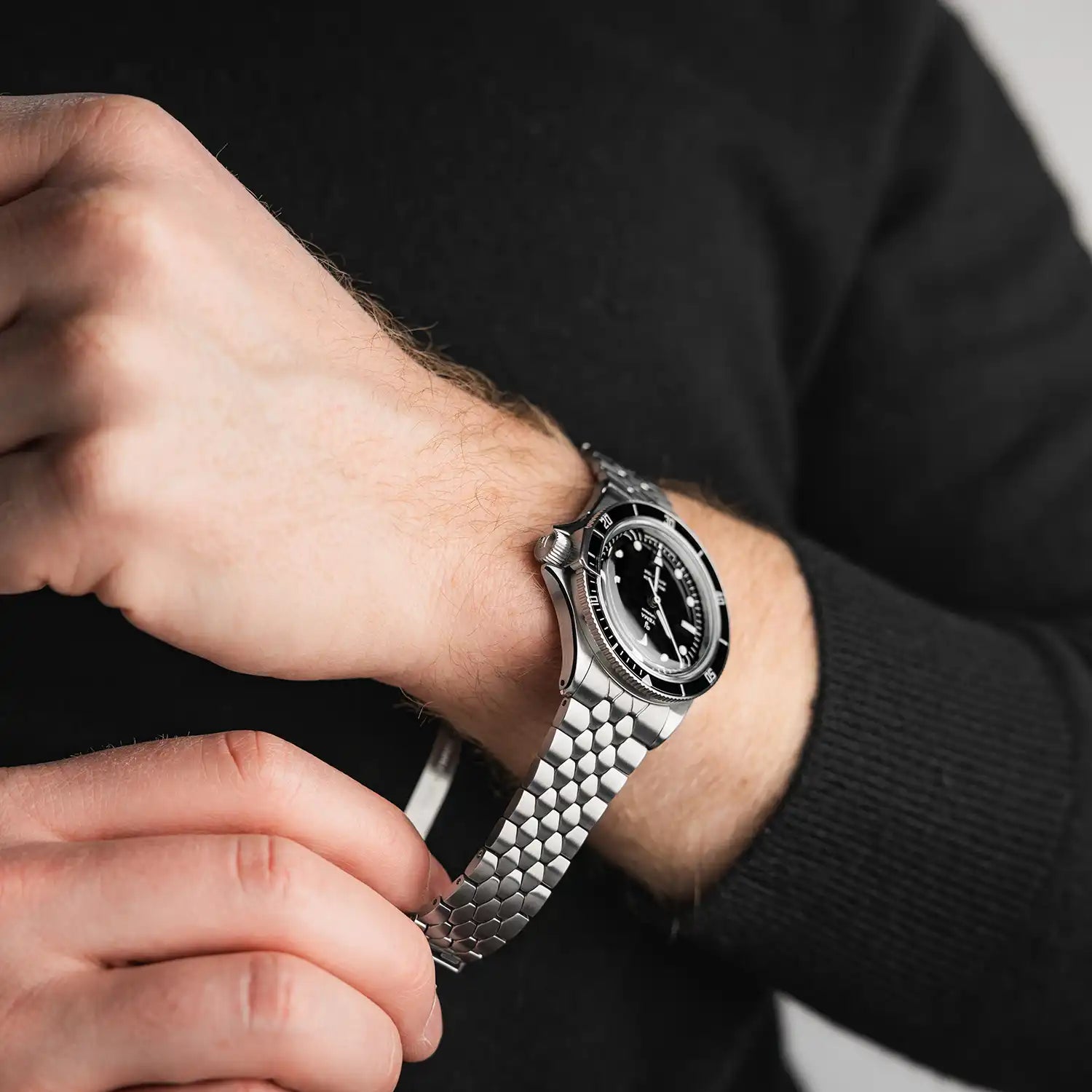 The double-security folding clasp includes a dive extension for easy and quick adjustment of the bracelet over a diving suit.