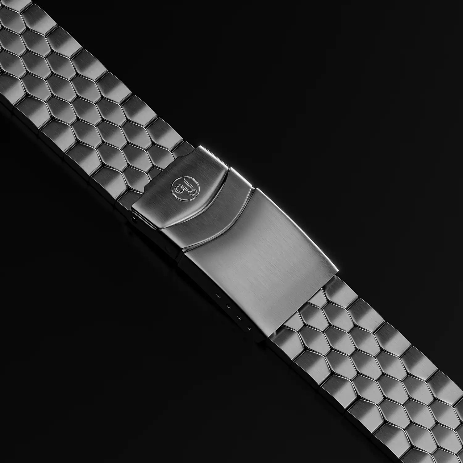 This new Scales Slim bracelet gradually tapers from 4mm at the buckle and naturally adapts to each wrist's shape. It features a fully brushed finish, providing an elegant visual continuity with the brushed steel case.