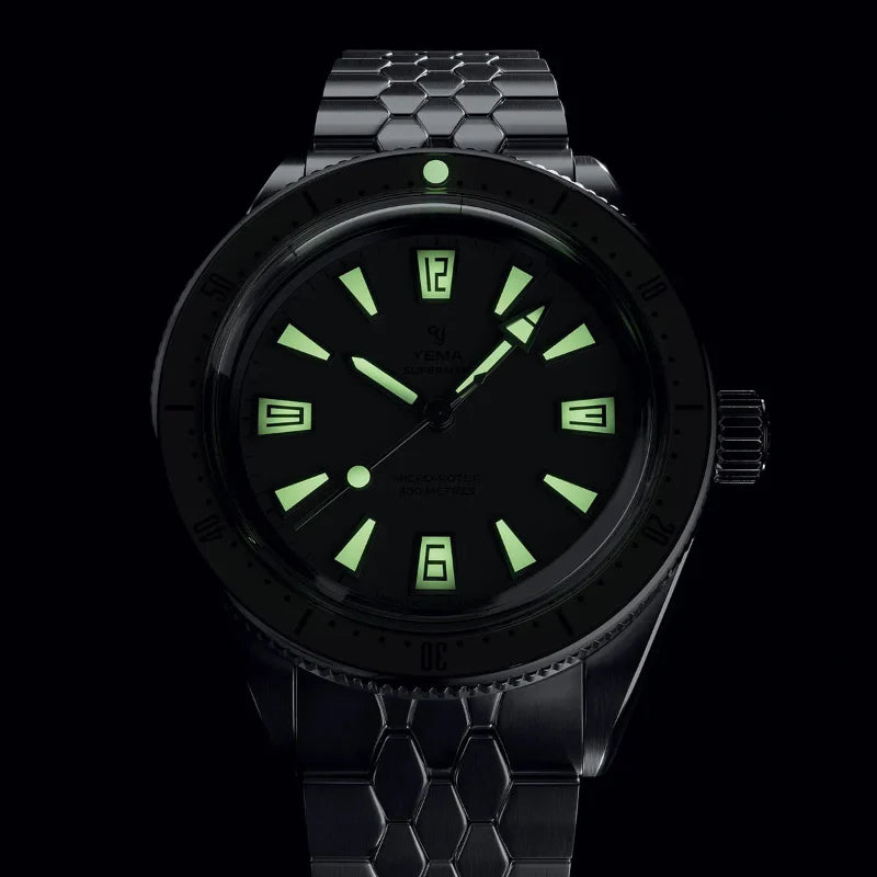 The hour markers, hands and bezel pipe are coated with Grade A Super-LumiNova for perfect readability even in the dark.