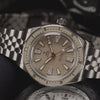 Inside the clasp, the final bracelet link is mounted on a precision-machined internal sliding rail. This rail enables smooth back-and-forth motion, allowing for up to 6mm of incremental adjustment in 1mm steps. For extra security, a dual-trigger system made of two push buttons unlocks the internal slide rail, enabling adjustment of the bracelet to the desired length. The mechanism is fully enclosed within the clasp, preserving the aesthetic and protecting it from dust and impact.