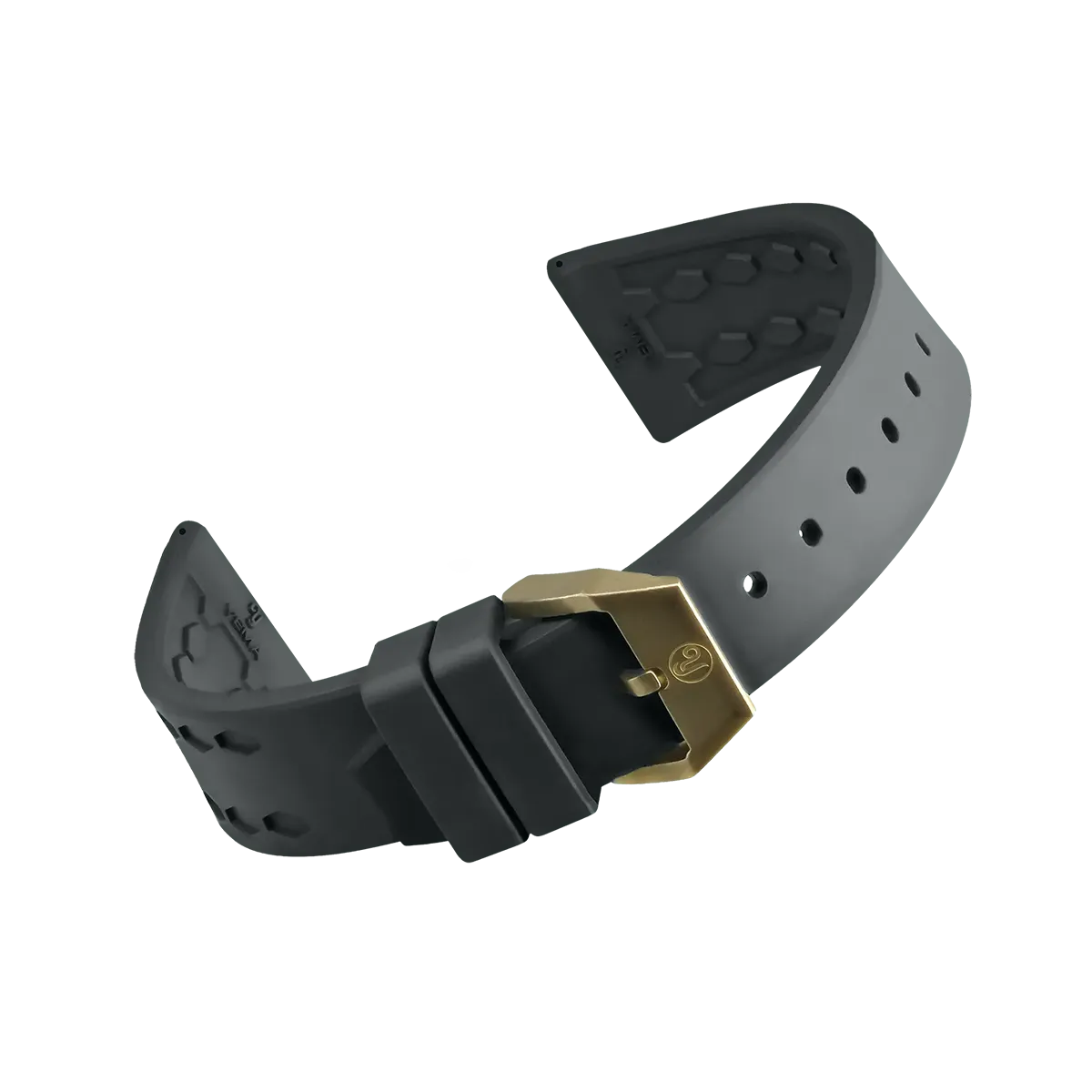 Specially designed for the Skin Diver Slim Bronze CMM.20 Limited Edition, this FKM VITON® rubber strap has been conceived for intensive use in all extreme conditions thanks to its light, flexible, dust repellant and very resistant VITON® material. It features YEMA’s distinctive “Scales” finishing, a geometric relief pattern sculpted into the surface to create depth. This textured motif isn’t just aesthetic: it adds a more technical, tool-watch character while improving grip and reducing the “flat” look typical of plain rubber straps.