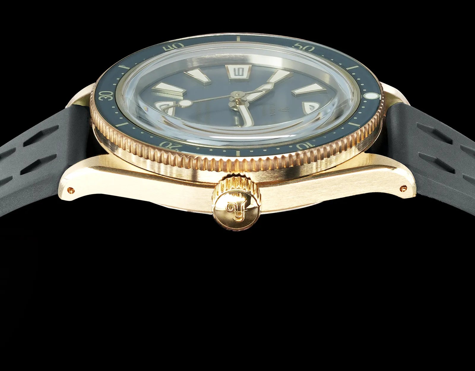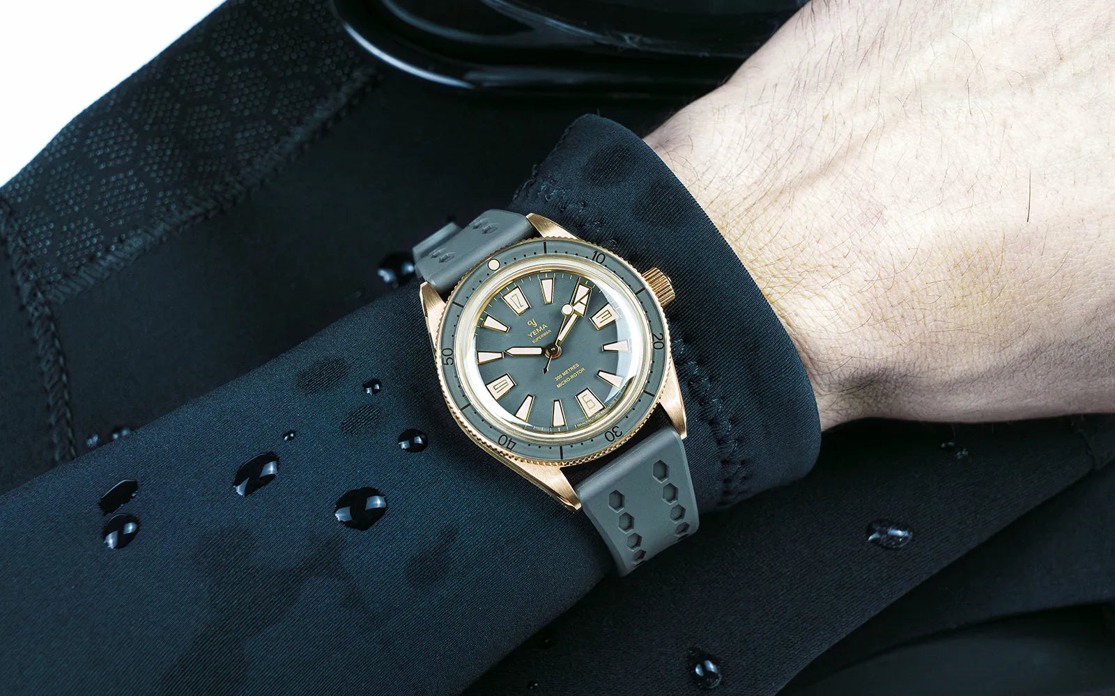 This bronze interpretation of YEMA’s emblematic 1960s skin divers looks and feels great on the wrist, exuding a vintage vibe and a distinctive retro flair. Strapping on the new rubber FKM VITON® Scales strap, the Skin Diver Slim Bronze CMM.20 wears incredibly comfortably and it’s refined and stylish enough to feel appropriate out of the water too.