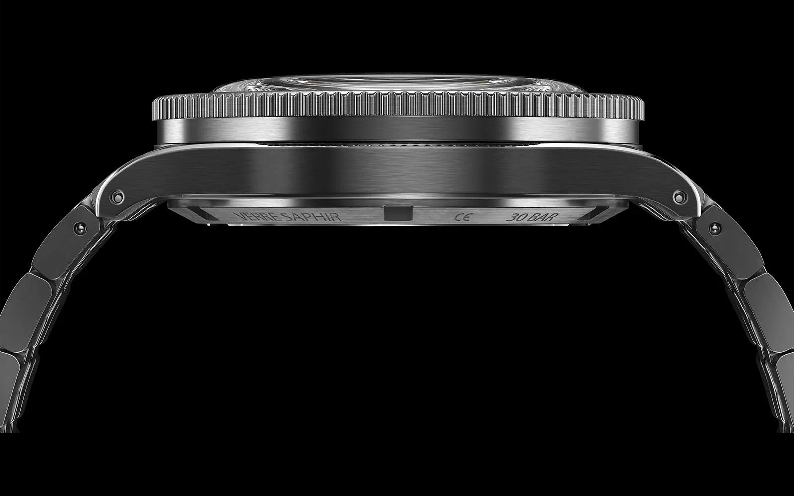 The rotating bezel stands out for its vintage-inspired “faded ghost” look. It is entirely made of sapphire and is in perfect harmony with the dark grey dial and the brushed finish of the case. This redesigned bezel features a unidirectional rotation, a 0-60 scale, and a luminescent marker at 12 o'clock treated in Grade A Super-LumiNova, which constitute essential features for professional diving watches.