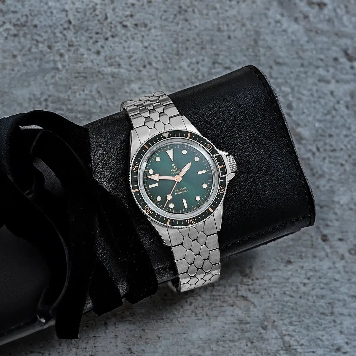 The iconic 1960s YEMA Scales bracelet has been slimmed down by 0.40mm so as to harmoniously integrate with the Superman CMM.10 refined cases.