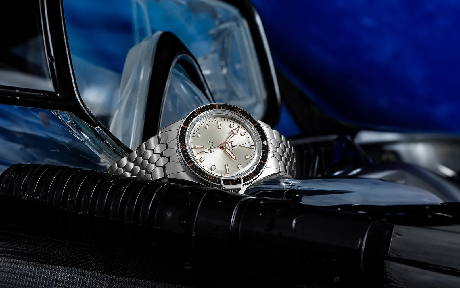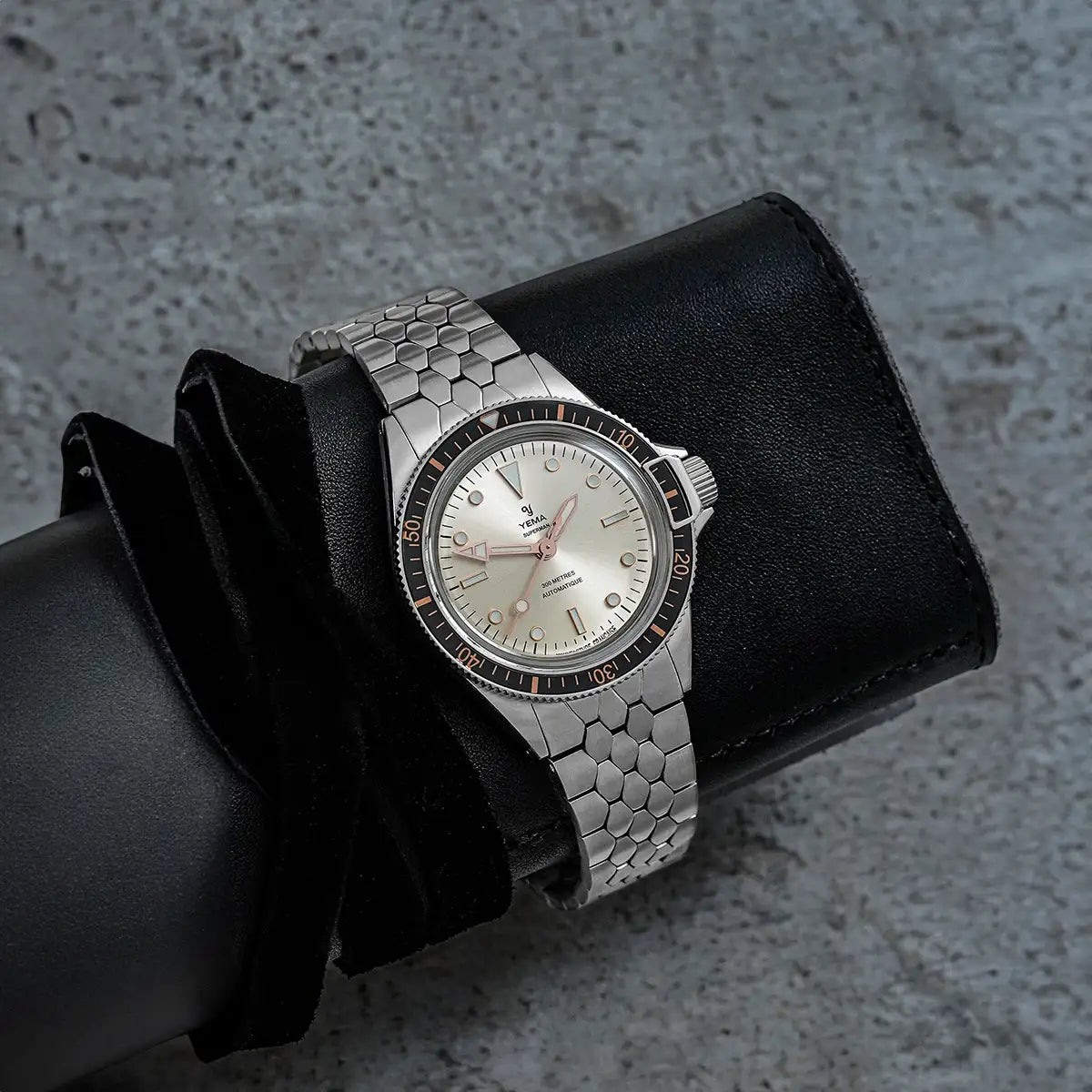 This new case also distinguishes by its elegant brushed surfaces with bevelled edges, mirror-polished for a striking contrast, preserving an unique neo-vintage appearance with all the advantages and functions of modern mechanical diving watches.