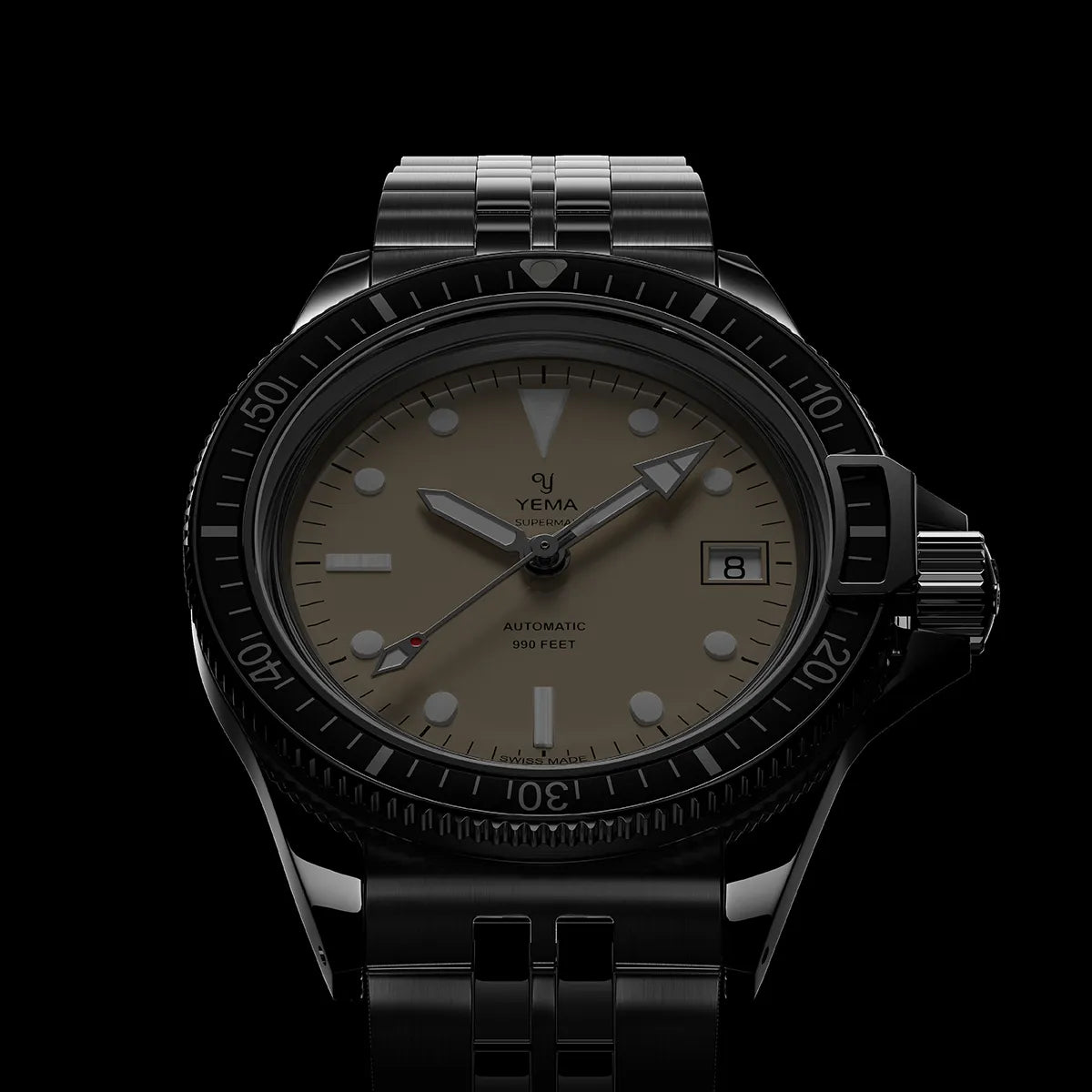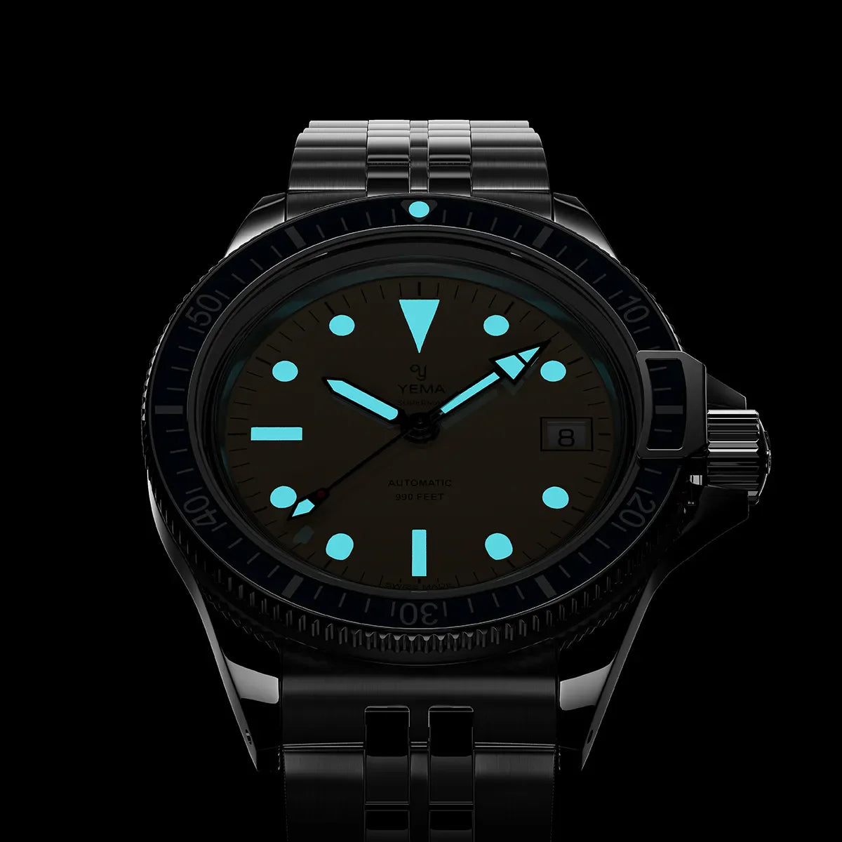 The hour markers, hands and bezel pipe are coated with Grade A Super-LumiNova for perfect readability even in the dark.