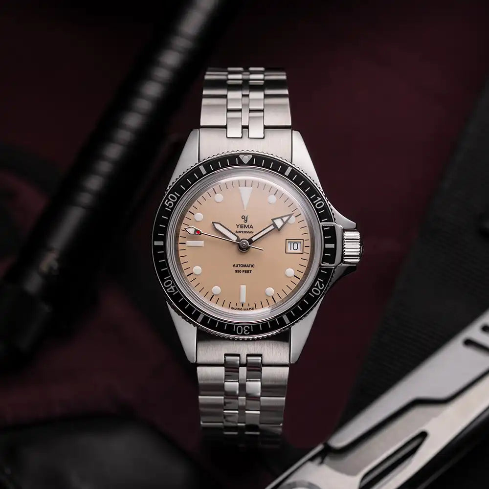 Over the years the YEMA Superman has become one of the most recognised French dive watches. The Superman Heritage model has preserved the aesthetic and vintage aspect of the original 1970s Superman while incorporating functional characteristics of contemporary professional diving watches.