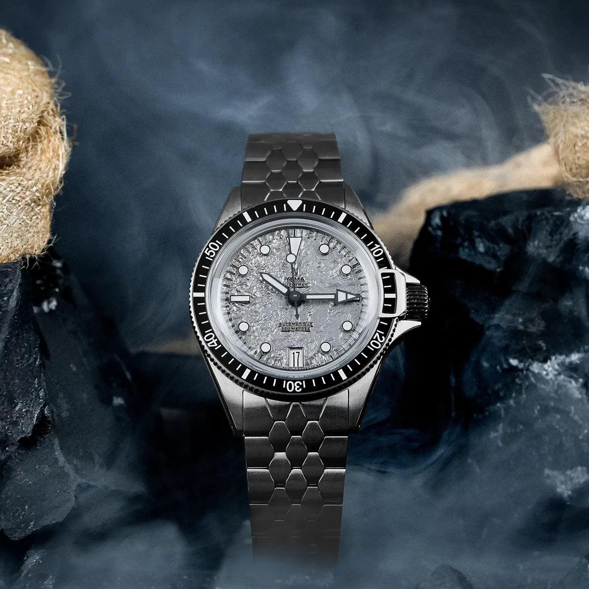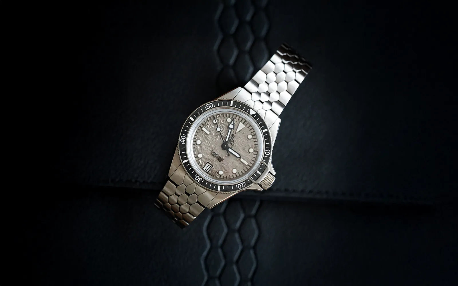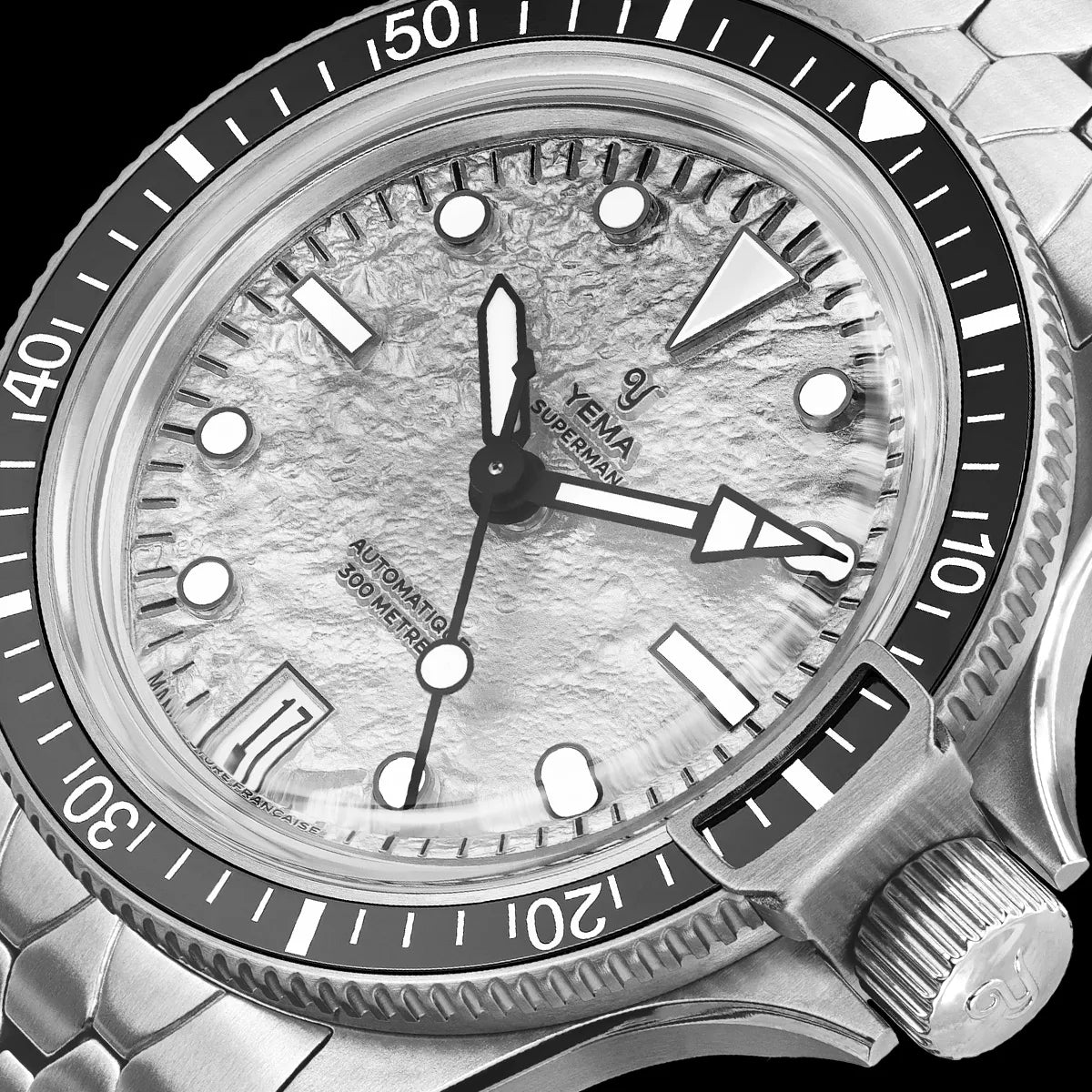 Inspired by the moon’s eternal influence on the oceans and limited to 400 timepieces, this original YEMA Superman captures the celestial force that commands the tides. Crafted entirely from Grade 2 titanium, the case, bracelet and textured lunar dial combine lightness, strength and a distinctive mineral character.