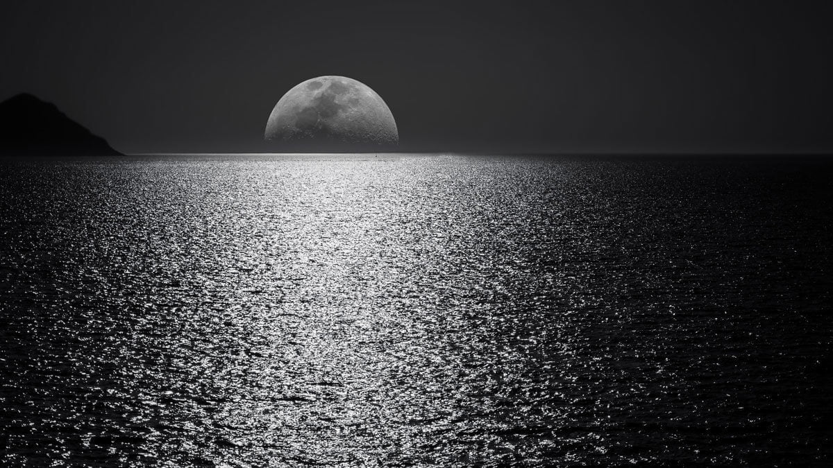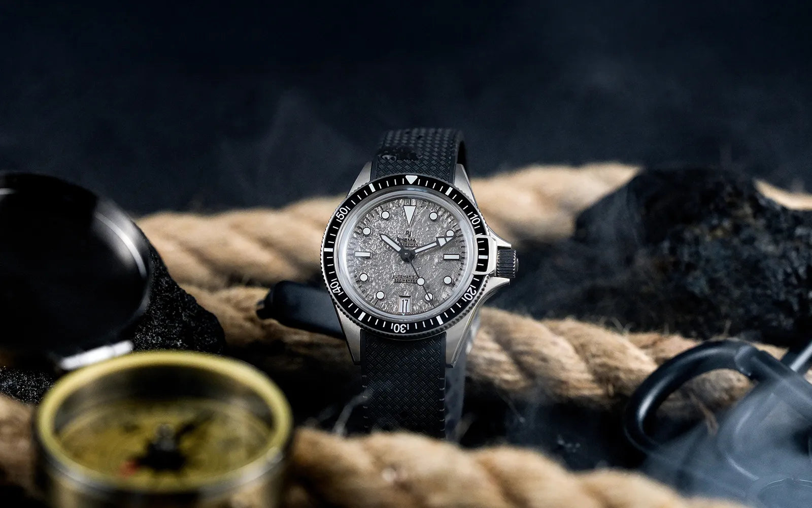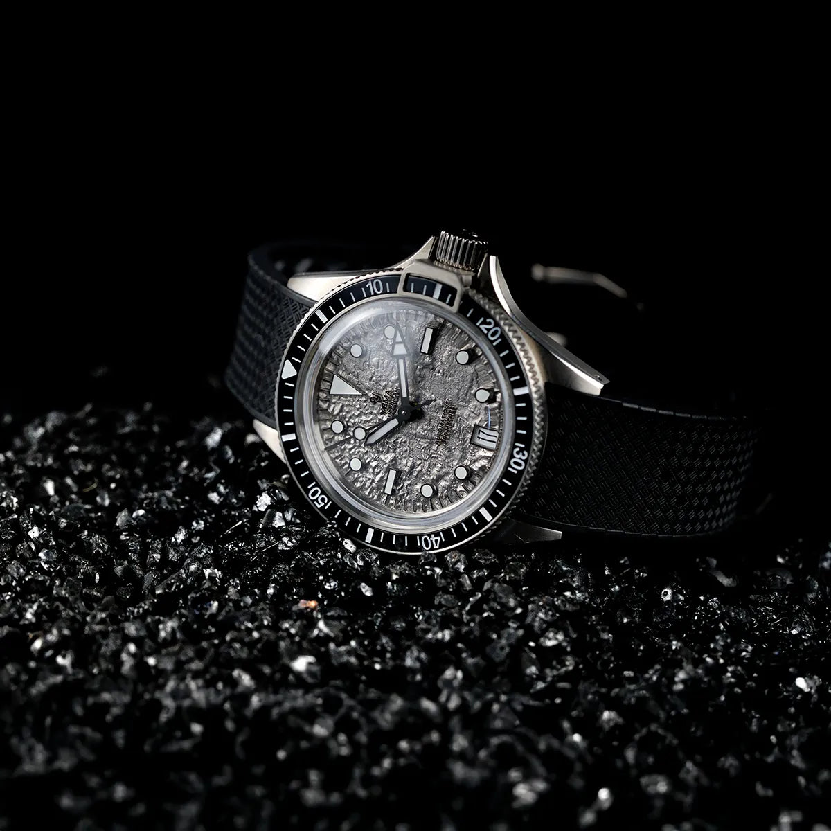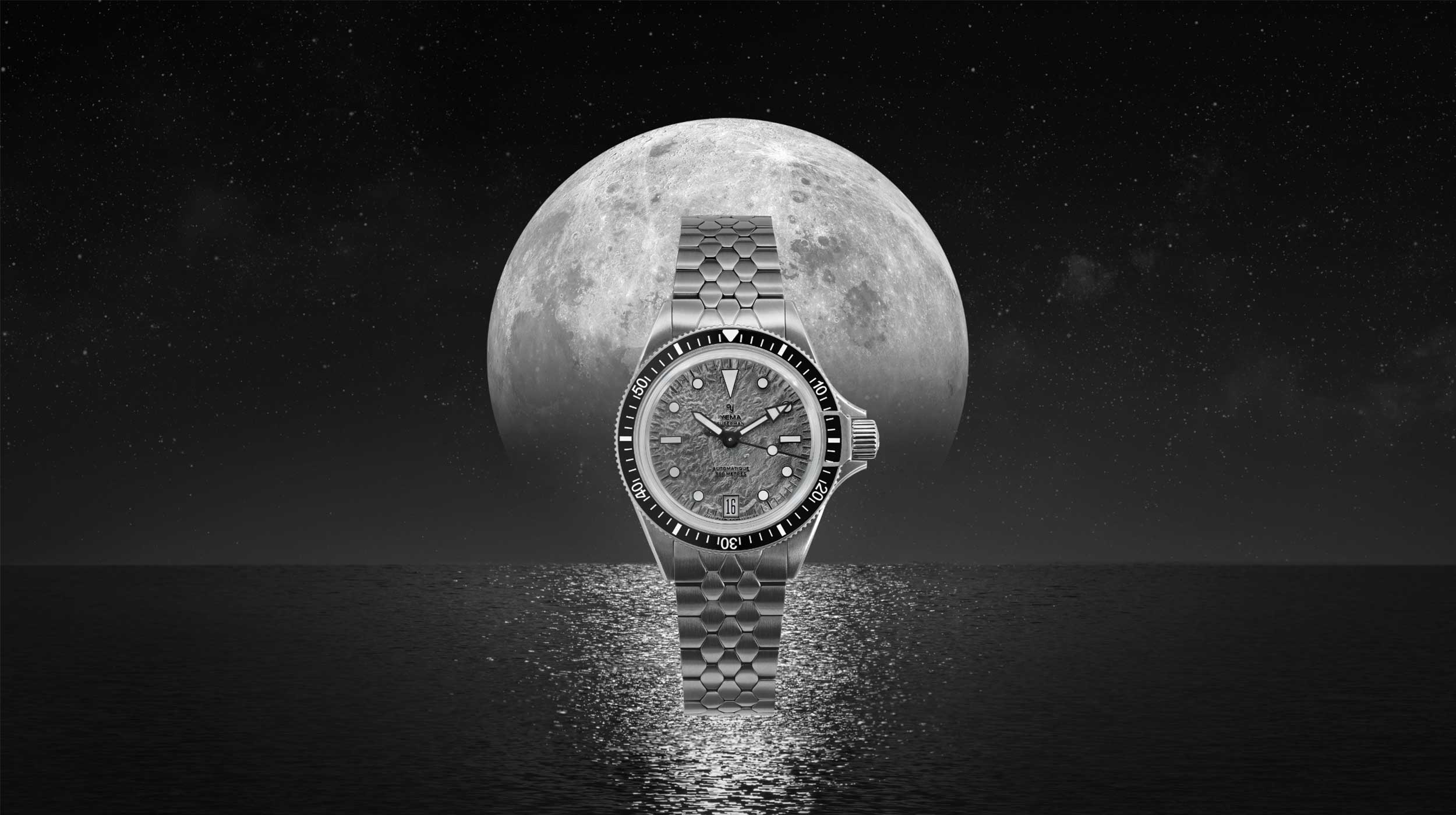 Inspired by the moon’s mineral surface, the textured titanium dial is shaped using an oil-press technique over a sandblasted base, creating a subtle cratered relief that plays with light like moonlight over the sea.