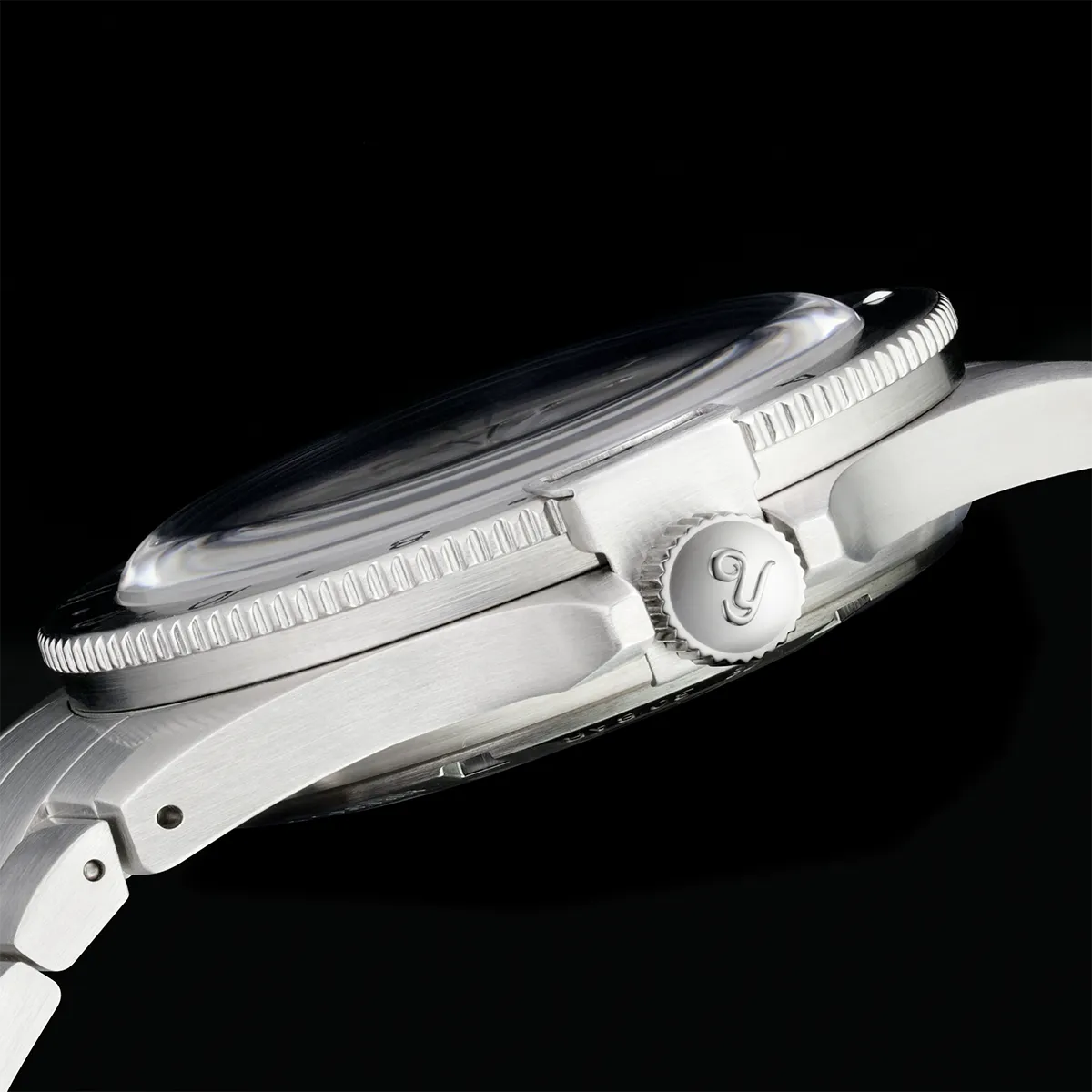 The 316 L stainless steel bracelet with secure-lock comes with a divers extension so it can be easily and quickly adjusted over a diving suit.