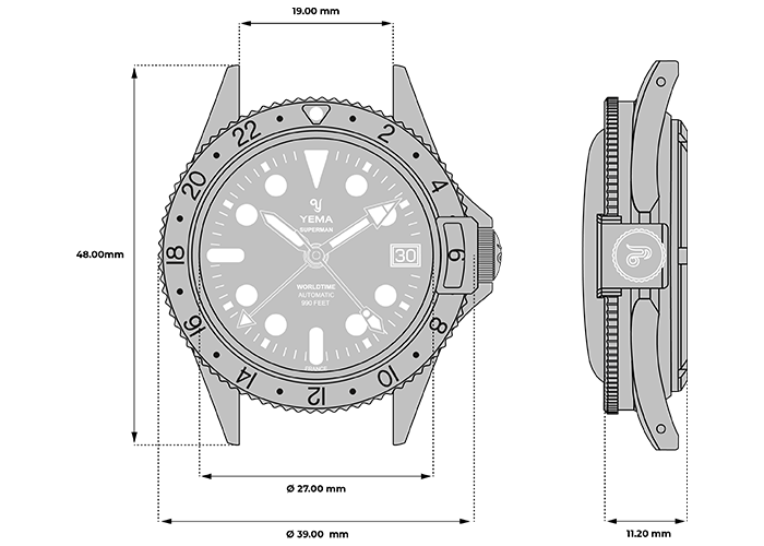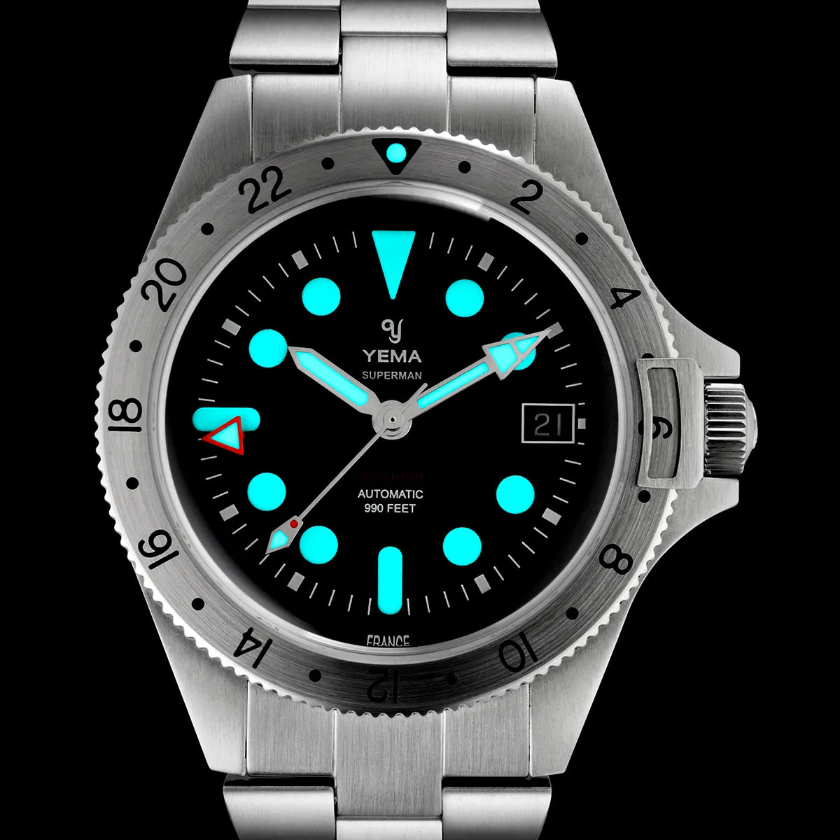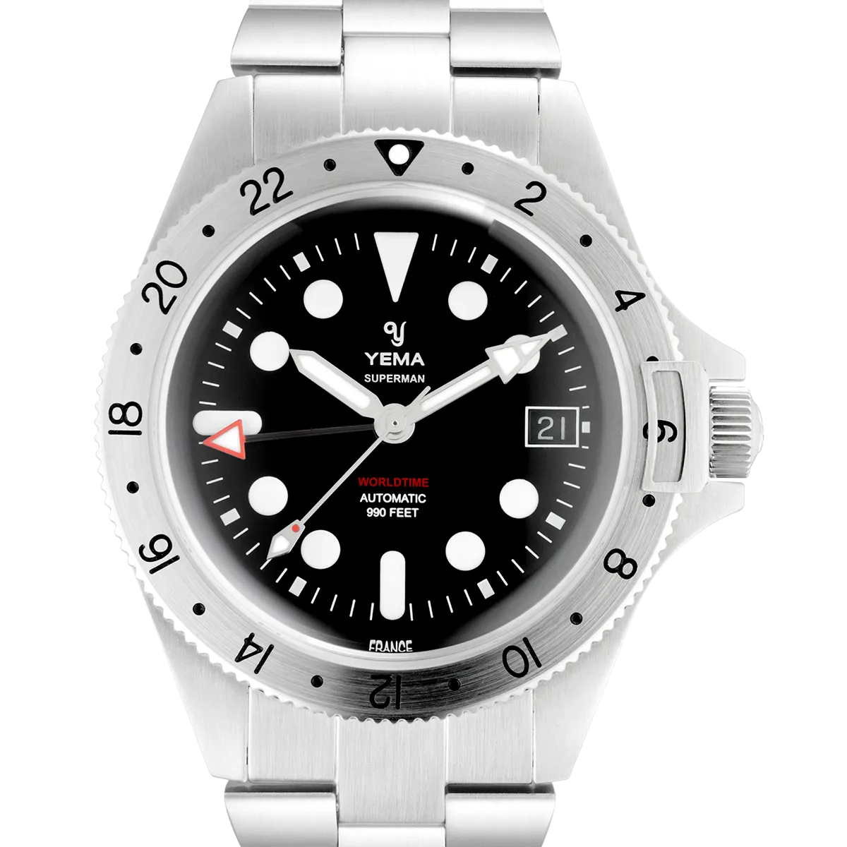 Instantly recognizable by its oversized markers, the Superman Worldtime inspires by YEMA’s Hattori period from start 1990's. Designed as a professional dive watch for globetrotters, this is the first timepiece in YEMA’s catalog equipped with our new GMT In-house Caliber YEMA3000.