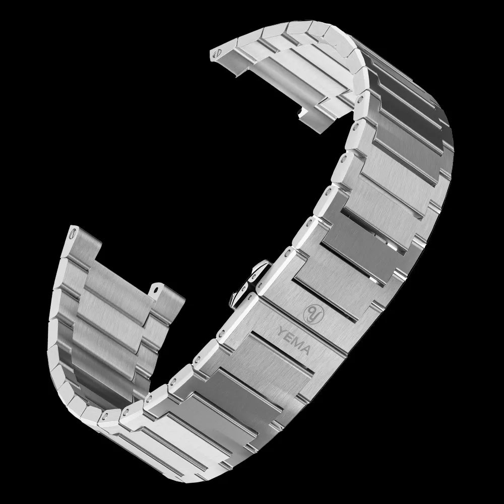 Engineered to achieve both precision fit and in exact correspondence with the case geometry, the strap integrates seamlessly into the lugs, preserving the watch’s streamlined silhouette. The profile tapers progressively toward the buckle, reducing bulk at the wrist while maintaining structural integrity. The stainless steel butterfly buckle features a brushed top surface with polished bevels and provides stable fastening while allowing easy adjustment.