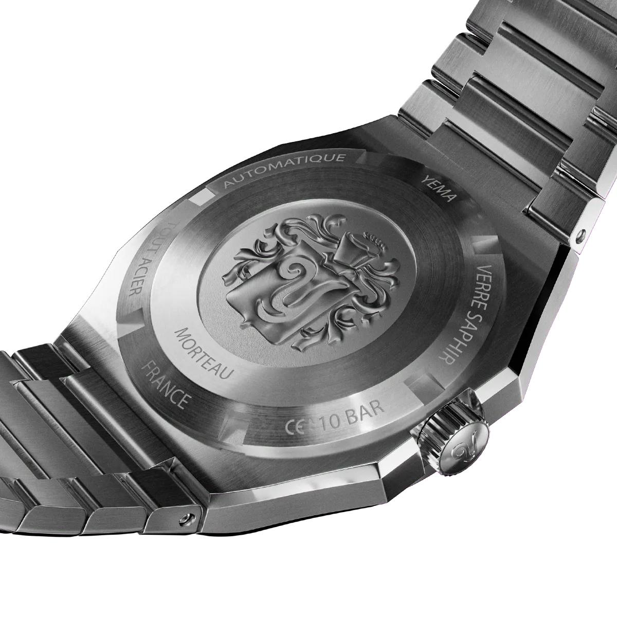 The great level of detail and finishes overall is also found on the steel case-back. Satin-polished and circular brushed finishes elegantly surround YEMA’s historic crest, which is carefully forged into the case-back with a hydraulic press, ensuring a qualitative and refined finishing.