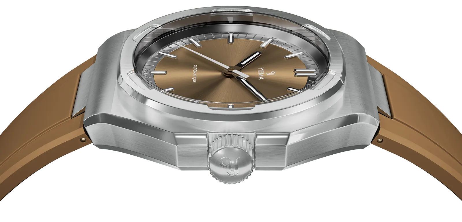 The iconic Urban Traveller with integrated bracelet makes its comeback in a dressy, refined collection featuring a sleeker case and three new sunray dials. Each model is paired with an FKM rubber integrated strap matching the dial colour, enhancing both style and comfort on the wrist.