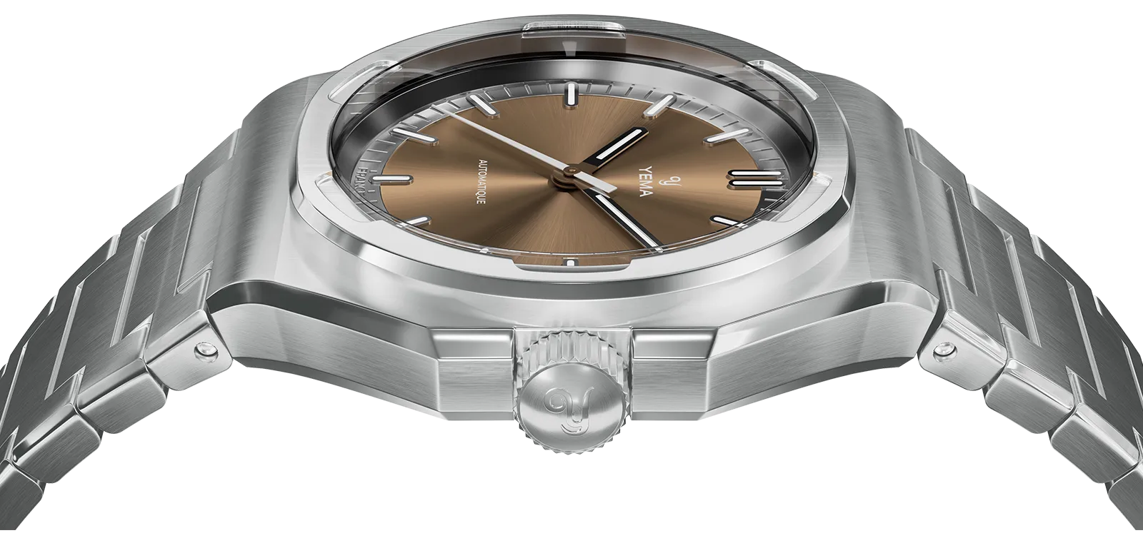 The bezel is inspired by a YEMA Sous-Marine model from the 1980’s and is made from a single piece of stainless steel, yet it has three distinct finishes, with the top and bottom bevels featuring an elegant vertical brushing and an entirely polished transition where the bezel’s horizontal and vertical surfaces meet.